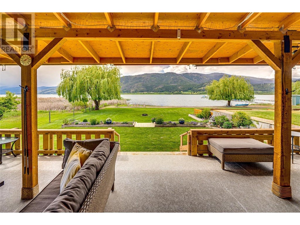 Life on the Beach...50' of Sandy Beach Front on Okanagan Lake that is! Picture walking out onto your back deck and looking across your backyard to a beachfront and mountain view. You can enjoy this every day from your lake front home. Just shy of 1300 sqft (1272), this 2018 custom built home is located in an unbeatable location on Okanagan Lake. Surrounded by nature with only 1 immediate neighbour, you'll be sure to soak up all the peace and serenity this property has to offer. The great room style main living area boasts abundant windows for loads of natural light, extra high ceilings, a large kitchen area with ample cupboard and counter space including a HUGE island & stainless appliances, and a cozy wood burning stove to supplement your winter heating bills. The main bedroom can accommodate a king bed and features a second set of sliding doors to your full length covered back deck. There is another generous bedroom, 2 full baths & a decent utility/pantry to complete your living area. Your outdoor area is second to none with covered decks front & back, a grassy yard with a firepit & then a sandy beach with a floating dock! Other features include 4 car parking, an RV pad, and a 720sqft attached garage/workshop. No property purchase tax, no monthly fees or annual property taxes just a current 25 year lease with an annual lease fee of approximately $6600. Please note this is on lease land and conventional financing is not available. (id:6289)