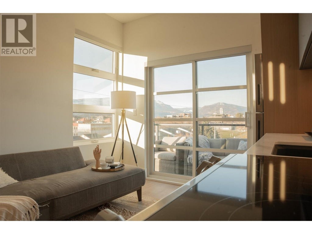 NO GST! Escape to your own modern oasis, filled with natural light enveloping this corner penthouse level, 5th floor studio. This ultra unique home has only one shared wall and floor, a balcony offering views of a vibrant Pandosy Village and a peek a boo lake view, and a secured parkade with one, of only a few, full size parking stall. Appointed with full size quality appliances, stacking washer/dryer, ample built in storage cabinets and shelves, quartz countertops, 9+ ft ceilings, and water resistant vinyl plank flooring. Only 3 homes on the top floor have a balcony! This is the premium location in this complex, being at the end of the hall and no one living above and only one neighbour sharing a wall, for ultimate privacy and reduced noise. The higher ceilings in the top floor offer a brighter and airy feel. Living at MARA at Pandosy Village means you enjoy top walk and bike scores, with an abundance of grocery stores, restaurants, shops, fitness centres, coffee shops, Okanagan College, Beaches, clinics and KGH, all within a few minutes commute. This complex boasts plenty of visitor parking,a security system, EV chargers, enclosed Bike Storage, and a Rooftop Community Patio with a lounging area and BBQ's. Built in 2024, this 5 storey boutique development encapsulates a perfect home nestled in a vibrant active community. Pets allowed, with restriction to 2, dogs max height 16"" at adult shoulder, no vicious breeds or history. (id:6289)