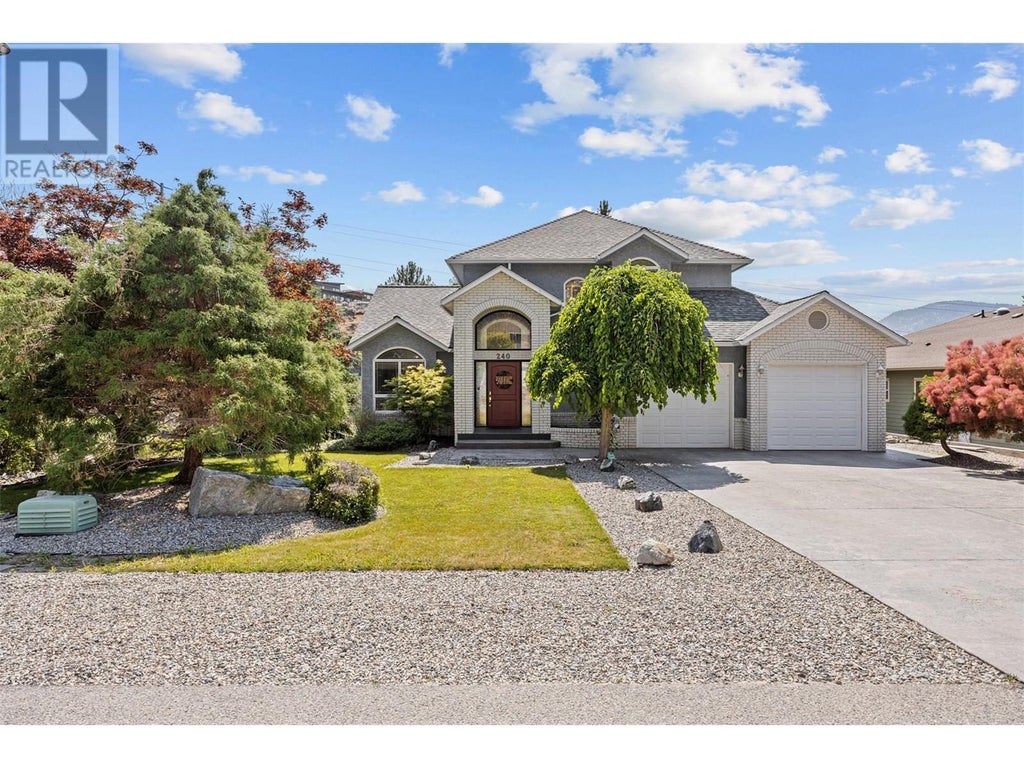 240 Heritage Boulevard, a showcase home! This versatile 5 bedroom, 4 bathroom home impresses with size, design and practicality for both family living and income potential. Located in the peaceful Heritage Hills neighborhood, this 4,250 sq ft home is just 10 minutes south of Penticton, offering privacy, space, and views of lake and valley. The main level features a double garage, extra parking, a front office, and two living rooms, including two lakeview decks off the kitchen nook. Upstairs, you’ll find a cozy nook, three spacious bedrooms, and two full bathrooms. The primary suite includes its own private lakeview deck, a walk-in closet, and an updated 5 piece ensuite. The lower level boasts a bright, self-contained two-bedroom BnB suite with a private patio, hot tub, and a second double garage with RV parking—perfect for extended family or rental income. This home has been thoughtfully updated with fresh paint throughout (walls, baseboards, doors in 2025), new door hardware, brand-new carpet on both staircases, a new roof in 2024, industrial hot water tank in 2024 and upgraded lighting and landscaping. Other features include in-floor heating, two gas fireplaces, and a 24’ x 29’ gym/studio/workshop. All situated on a private 0.5-acre lot with a natural creek and wooded ravine. Come see for yourself this all-in-one exceptional property. (id:6289)