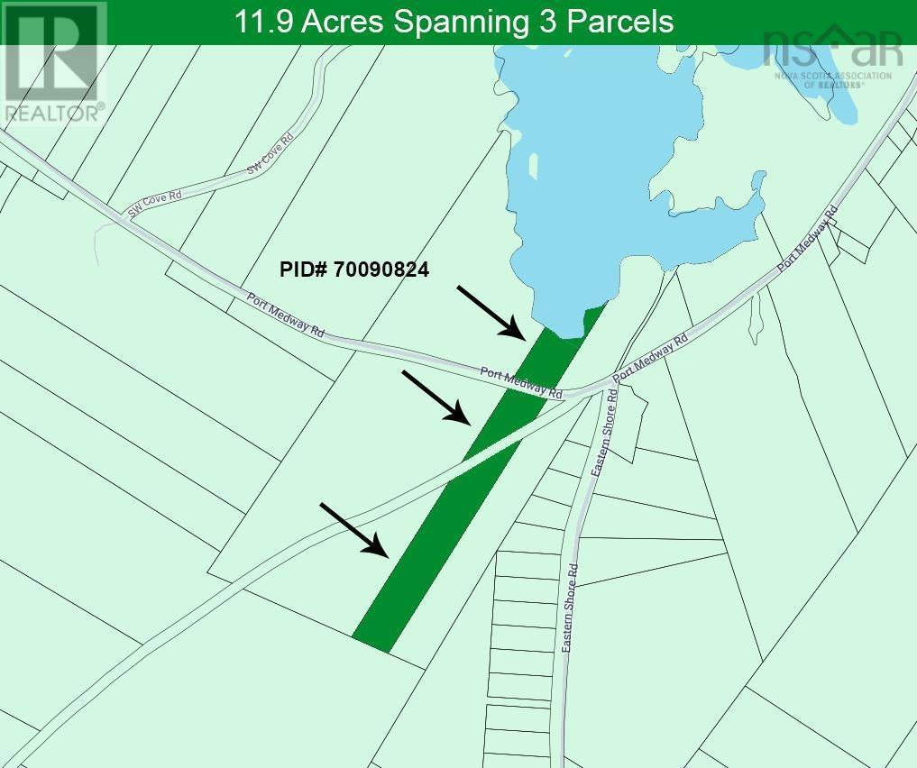 11.9 acres spread over three separate parcels in the picturesque South Shore Nova Scotia community of Port Medway, a charming and historic village that originally thrived on shipbuilding, but to this day remains a working fishing port. A new owner may wish to subdivide the three distinct parcels that constitute the single PID #, creating acreage (roughly 7.5 acres +/-), a smaller lot (approx. 2 acres +/-) bordered by Port Medway Road and Old Port Medway Road, plus ocean frontage, also in the 2-acre range. Please note that these sizes are estimates only as no surveying or migration has been done. The calmer waters of Southwest Cove are ideal for a future dock from which to launch nautical adventures of all types. The greater Port Medway region is already known as one of the best locations in Nova Scotia for sea kayaking, plus there is quick access to the open Atlantic Ocean and beyond! The areas spectacular geography is home to two nearby conservation areas that protect distinct habitats of bird, sea and wildlife. The small islands that dot the cove and nearby waters provide stunning and ever-changing views from a seasonal or year-round dwelling. (id:6289)