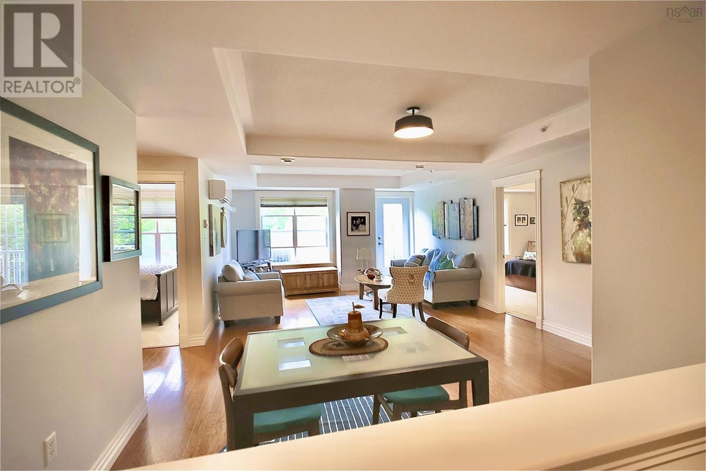 Amazing opportunity to get into this beautiful 2 bedroom, 2 bath condo in the heart of Mahone Bay. The Quinlan is an extremely well managed and well kept 34 unit building with underground parking, spacious common areas and beautifully landscaped grounds. Entering the unit, you will appreciate the open concept floor plan, hardwood floors and the natural light coming in through the wall of windows. The primary bedroom is large with access to a well laid out walk in closet and an ensuite with a corner shower. The second bedroom has big windows, a nice closet and quick access to the second bathroom just down the hall. The kitchen is well appointed and opens to the eating nook and spacious living area with access to your private balcony with views of the property. Other features of this home include a newer heat pump, secure indoor parking with additional storage space and a large common area for residents located on the first floor. (id:6289)