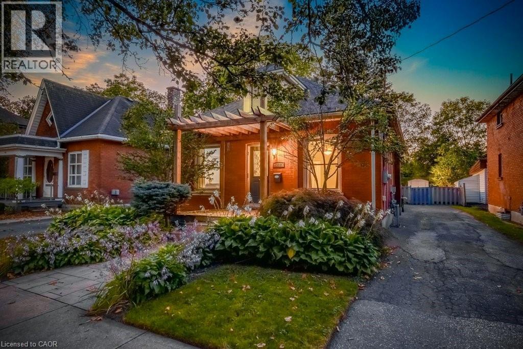 Private Backyard Retreat Backing Onto Green Space & River Trails. Whether you’re a first-time buyer or looking to downsize, you will fall in love with this enchanting brick bungalow tucked onto a mature, tree-lined street. Step inside the front foyer to find a cozy living room warmed by a natural gas fireplace and a family-style dining room that flows seamlessly into the modern white kitchen designed to impress. An abundance of cabinetry and counter space are complimented by granite countertops and a functional island with second sink and dishwasher. Garden doors invite you outside to a private backyard retreat that feels worlds away from city life. Enhanced landscaping creates a layered outdoor experience: a large deck with gazebo for gatherings, accent lighting, raised vegetable garden, a tranquil pond complete with several koi and a stone conversation area tucked toward the back of the deep lot. You’ll enjoy having the SC Johnson Trail and the Grand River nearby for walking, biking or simply taking in nature. Practical touches include a large 4-piece bath with separate tub and shower. Shingles approximately 4.5 years. Furnace - 2024. The basement is a great space for storage, workshop or home gym. Plenty of parking. Reward yourself with the perfect combination of historic charm of this cute brick bungalow and outdoor beauty. Get ready to move! (id:6289)