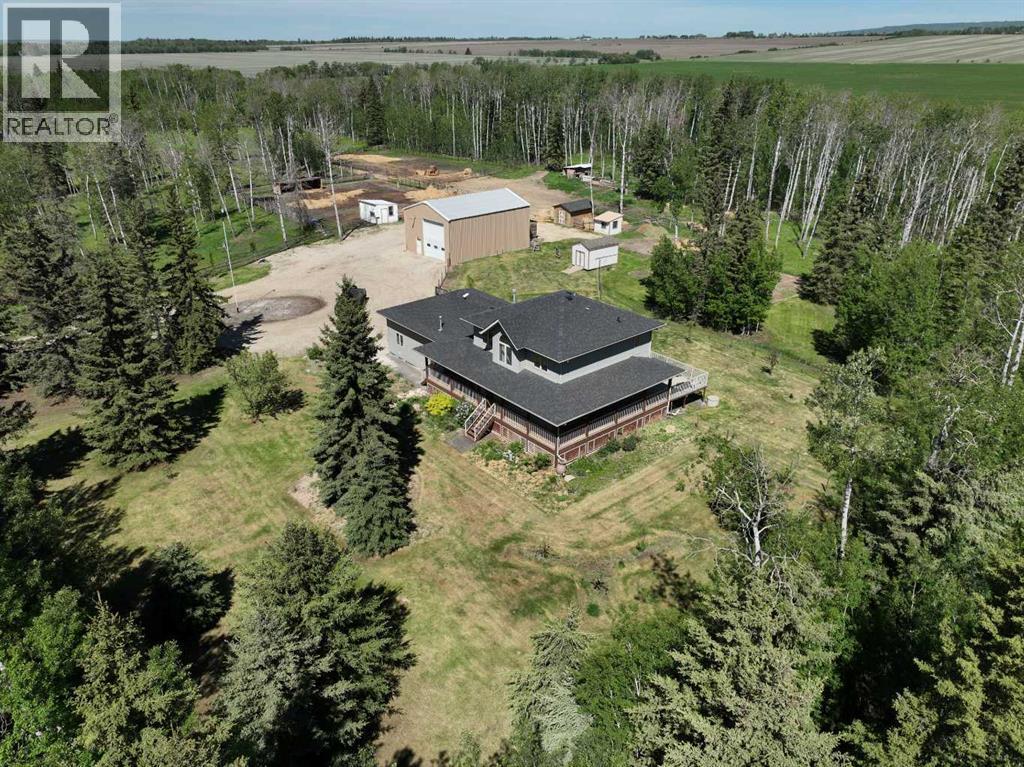 Incredible Hobby Farm / Homestead on 38 Treed Acres with CR5 Zoning & 32 x 44 Shop!Welcome to this spectacular custom-built 2-storey home, perfectly set up for country living with endless potential! Situated on 38 private, beautifully treed acres with subdivision opportunity, this property is ideal for a growing family, home-based business, or hobby farming. Mature poplar and spruce provide year-round beauty, while a wraparound covered veranda overlooks the fully landscaped yard—your private retreat in nature.This home features a bright open-concept main floor with hardwood flooring, spacious living and dining areas, a cozy gas fireplace, and a large kitchen complete with island, corner pantry, and loads of counter space. A front office/bedroom, 2-piece bath, and main floor laundry with sink and access to the attached 30x30 heated garage round out the main level.Upstairs has just undergone a stunning $65,000 renovation. The spacious primary suite boasts a custom walk-through closet and a fully updated ensuite with freestanding tub, glass & tile shower, and dual sinks. Two more generous bedrooms and all-new $16/sq ft carpeting complete the upper level. Additional upgrades include new trim throughout, a new hot water tank and central air (May 2023), and new shingles (June 2024).The fully developed basement offers walk-up access to the garage, a large rec room, games area, full bathroom, and space to easily add a fifth bedroom.Outside, the property is turnkey for hobby farming or equestrian use with cross fencing and 3 paddocks with shared auto waterer. A heated, fully finished 32x44 shop with 18’ ceilings offer exceptional space for vehicles, equipment, or projects. Also included are two dugouts (110’x110’x30’ deep and 50’x50’x12’ deep), a greenhouse, firepit, and pond. Over $25,000 in gravel has been added to the yard in the past 2 years.Other highlights: ICF foundation, 2 furnaces, 19 GPM well, garage recently drywalled and painted (Summer 2024). Starlink is installed and included for added convenience. Directions: From Hwy 43 west of Wembley, turn south on RR85 to Twp Rd 710 and west 1.25 miles. (id:6289)