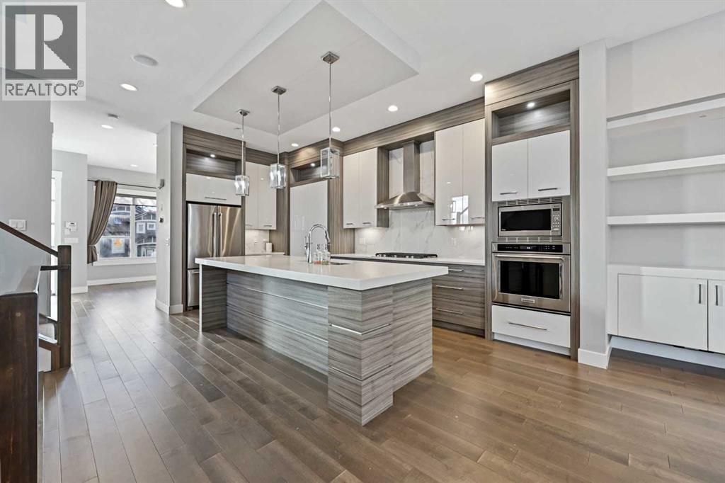 Welcome to the extremely sought after community of Marda Loop! This stunning 4 bedroom home offers nearly 3000 sq ft of developed living space. The main level presents high 10 ft ceilings, hardwood floors, and an effortless open-concept plan, perfect for entertaining. The dining room flows into the kitchen, displaying a very modern design that includes quartz countertops, a large island, sleek white cabinetry, and stainless steel appliances. The living room hosts a captivating floor to ceiling gas fireplace feature and built in media wall. The big windows let you see what a beautiful day it is in the backyard, where you can host a BBQ on the deck or anything else. A 2 piece powder room completes the main level. The second level features 3 bedrooms, a 4 piece bathroom and laundry. You’ll see that the master bedroom features vaulted ceilings and windows, adding extra light to every corner. It also has a private balcony, a walk-in closet, and a 5 piece ensuite with double vanity sinks, a relaxing soaker tub, and a separate jetted shower. The basement is developed with a large family room, a wet bar, a 4 piece bathroom, and a fourth bedroom with a spacious closet. This home also includes AIR CONDITIONING, built in Sonos system, an alarm system, and a double detached garage. You are right on 33rd ave, giving you access to all the trendy shops and restaurants, such as Belmont Diner, Original Joes, and many more to choose from! This home is near excellent schools for all ages and sectors, transit, shops, and many markets. River Park is steps away, with beautiful views of the city skyline and the river, as well as Sandy Beach park. Access is not an issue with downtown Calgary being just a short 10 minute drive via 14th street! Don’t miss your opportunity to live in one of Calgary’s most vibrant and desirable neighbourhoods. Call to book your showing today! (id:6289)