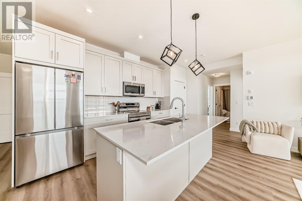 Welcome to this stunning 2-bedroom, 2-bathroom condo located in the dynamic community of Livingston in NW Calgary. Perfectly combining style, comfort, and functionality, this modern home offers everything you need for an elevated urban lifestyle.Upon entering, you’ll be greeted by an open-concept layout that seamlessly connects the living, dining, and kitchen areas, creating an inviting and airy space. The kitchen is a chef’s dream, featuring premium quartz countertops, sleek modern cabinetry, high-end stainless steel appliances, and an elegant backsplash that adds a touch of sophistication.The living area extends to a large private balcony. Whether you’re enjoying a morning coffee or entertaining friends, this outdoor space is sure to impress.Both bedrooms are generously sized, with the primary suite offering its own private balcony access, a spa-inspired ensuite with dual vanities, a modern glass shower, and a spacious walk-in closet. The second bedroom, conveniently located near the 3-piece main bath, can serve as a guest room, home office, or personal gym—whatever suits your lifestyle.Additional highlights include light wood luxury vinyl flooring, neutral designer tones throughout, air conditioning, a titled underground parking stall, and a secure storage unit for added convenience.Livingston is one of Calgary’s most sought-after communities, known for its vibrant atmosphere, beautifully landscaped green spaces, and incredible amenities. From urban conveniences to scenic charm, this neighborhood has it all.This exceptional property is more than just a home; it’s a lifestyle. Don’t miss the chance to make it yours—schedule your private tour today! (id:6289)