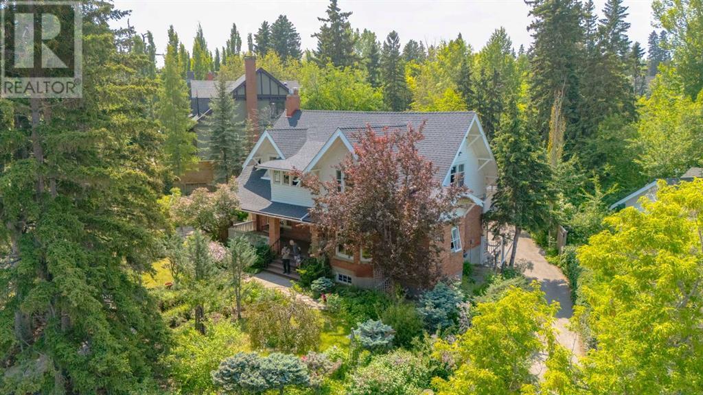 Welcome to the Rideout (Mitchell-Sproule) Residence, a designated Municipal Historic Resource located in Calgary’s sought-after Upper Mount Royal community. Built in 1912, this beautifully maintained Craftsman-style home offers a rare blend of preserved heritage detail and thoughtful modern updates. Positioned on a quiet pie-shaped lot, the property enjoys elevated views of the downtown skyline and Nose Hill Park.This two-storey residence features four generously sized bedrooms, a comfortable library or entertainment area, and a wine/root cellar tucked beneath a main floor powder room added in 2015. The original millwork with leaded glass, restored quarter-sawn oak, and a hidden liquor cabinet from the Prohibition era speak to the home’s storied past. A major renovation completed in the 1990s introduced radiant stone floor heating, oak hardwood, and custom finishes throughout, enhancing comfort while maintaining architectural integrity.The kitchen, renovated in 1995 by Empire Kitchen & Bath, includes Downsview cabinetry, a Sub-Zero refrigerator, a custom copper hood fan, and city-facing windows that bring natural light into the space. The front veranda overlooks a mature garden established over 77 years ago, now a vibrant arboretum featuring multiple species of larch trees and a tranquil pond that attracts a variety of birds. Outdoor dining areas are integrated into the landscape, creating a private urban retreat.Heating is provided through a combination of radiant and hot water baseboard systems. A wood-burning fireplace anchors the main living area, while leaded-glass built-ins and original detailing add warmth and character. There is potential to reconfigure the upper level to create a spacious primary suite. The property also includes an oversized detached double garage, providing ample space for vehicles and storage.This home offers a unique opportunity to own a piece of Calgary’s architectural history, with all the benefits of contemporary urban living in a premier inner-city location. (id:6289)
