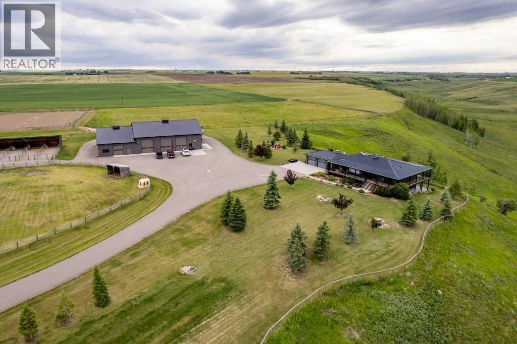 An equestrian dream awaits on this immaculate 79.5-acre property east of Crossfield, designed with horse lovers and outdoor enthusiasts in mind. Fully paved to your doorstep, this impeccable set up features a lovely 3 bedroom ranch bungalow w/ 3128 sf total development with wrap around deck and beautiful landscaping overlooking a pastoral coulee and creek to the North. At the heart of the property is a heated 6,000 sq ft shop/barn with oversized doors, in-floor heat, and a comfortable self-contained guest area (not permitted as an ADU). The barn includes a drive-through bay for easy livestock handling or parking your motorhome/ truck & trailer (19’ x 58’), a large shop area (44’ x 29.5’), gorgeous barn with four oversized box stalls, tie-stall space, a vet-grade walkthrough bath/vetting station with hot and cold water, and a well-appointed tack room/office. This building has two bathrooms, one on the lower area with a shower and a second on the upper floor as well as laundry.Outside you will love the professional 140’ x 220’ outdoor arena with roping boxes, an alley for cattle, and an adjacent holding pen, perfect for your multidisciplinary equestrian pursuits. There are six 50’ x 15’ turn out pens, each with shelters, auto waterers and feeders. There are several grass pastures and approximately 60 acres are leased annually for crop, offering added versatility and farm income potential.The house has modern country charm, nestled on a hillside to take full advantage of stunning coulee and creek views, enjoyed from the massive wraparound veranda. Inside, the home offers a comfortable and versatile layout with a custom kitchen featuring granite countertops, a 36” Capital gas range with a pot filler, prep island with seating and ample dining space. The kitchen flows into a bright living room with cozy gas fireplace and a large formal dining area perfect for entertaining.There are two bedrooms on the main floor, including one with a 3 piece ensuite bath with access to the covered deck. Downstairs the beautifully finished walkout basement is a private retreat with a spa-inspired primary suite including a large walk-in closet, ensuite, laundry, and garden doors opening to a hot tub-ready patio. A generous second living room featuring custom built-ins and full bar area complete the lower level, offering space and comfort for both relaxation and entertaining. The house has a double attached heated garage with epoxy floor which is currently being used as a man cave/ gym space.Conveniently located just 20 minutes north of Calgary International Airport—and only 5 minutes from Irvine’s Western Store—this property combines rural tranquility with unbeatable accessibility. Pavement leads right to the front door, and the home is set well back from the road, offering exceptional privacy. A secure Command Gate ensures controlled access and added peace of mind, while page wire fencing surrounds the yard to keep your four-legged companions safe. Ag-Gen zoning. GST applicable. (id:6289)