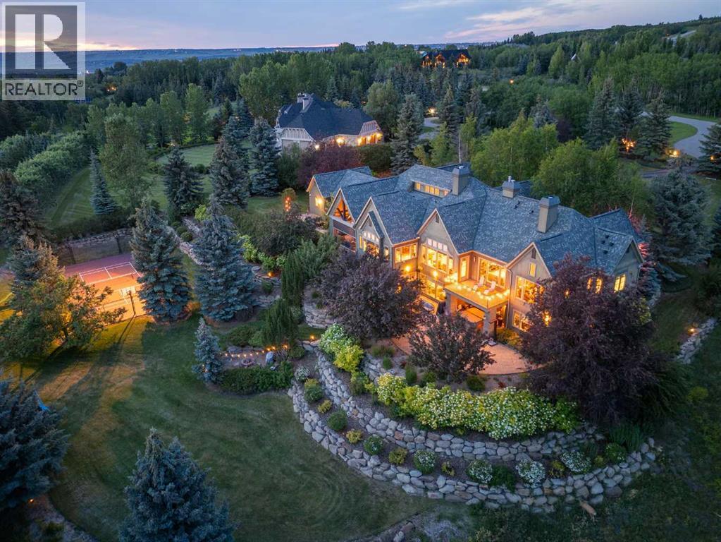 Set on two beautifully landscaped acres at the end of an exclusive Central Springbank cul-de-sac, this extraordinary 3,124 sq ft walkout bungalow enjoys a prime ridge-top position with sweeping views of the Rocky Mountains. Originally custom built by Waterford Homes and extensively renovated by Rockwood Custom Homes, this one-of-a-kind residence offers over 6,000 sq ft of refined living space that blends timeless elegance with family functionality.The home features 5 bedrooms, 6 bathrooms, 3 gas fireplaces, and a private home office. Every detail reflects premium craftsmanship—from soaring vaulted ceilings and rich millwork to heated limestone flooring and superior architectural elements. A new roof was installed in 2022, adding further peace of mind.The designer kitchen is a chef’s dream, equipped with a Wolf 6-burner gas stove and steam oven, Sub-Zero fridge, Thermador stand-up freezer, Miele espresso machine, and two built-in dishwashers. A striking basalt slab backsplash, expansive quartz island, and custom cabinetry create a space that’s as functional as it is stylish. A double-sided fireplace adds warmth and charm to both the kitchen and adjacent living space.Entertain with ease in the formal dining room, enhanced by arched windows and exquisite wood detailing, or dine on the fully covered west-facing patio—complete with vaulted timber ceilings, commercial-grade heaters, and phantom screens for year-round enjoyment.The luxurious primary suite includes a private office nook with a dual-sided fireplace, built-in shelving, a spacious walk-in closet, and a spa-inspired 6-piece ensuite with heated floors, steam shower, and Toto automatic toilet.The bright and open walkout basement offers endless possibilities with its floor-to-ceiling windows, radiant heated limestone floors, and a full wet bar featuring a Miele fridge and freezer. This level also includes three additional bedrooms, two full bathrooms, and ample space for a home theatre, gym, or games room.Ad ditional features include air conditioning, a private pickleball/tennis court, hot tub, outdoor fire pit, fenced dog run and dog wash, oversized 4-car garage, and a built-in media system throughout.This ridge-top gem offers unparalleled privacy, mountain views, and high-end comfort—all just minutes from city conveniences. (id:6289)