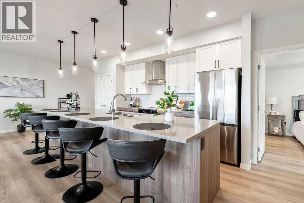 Welcome to this stunning, brand-new corner unit in the vibrant community of Belmont, built by award-winning Cedarglen Living! This thoughtfully designed 2-bedroom, 2-bathroom home offers 1,052 sq ft (RMS) of bright, open-concept living with 9’ knock-down ceilings and an abundance of natural light.Enjoy over $27,000 in premium builder upgrades, including a GORGEOUS extended kitchen island, stylish two-toned cabinetry, upgraded kitchen tile, luxury vinyl plank flooring throughout, soft-close hinges, built-in recycle center, upgraded appliance package (with water line to fridge), and upgraded closet shelving. The upgraded cozy electric fireplace and 1.5-ton A/C unit add comfort year-round.The spacious primary bedroom features a dual-sink ensuite and a large walk-in closet. A versatile second bedroom is perfect for guests, a home office, or a creative space. The open living and dining areas extend seamlessly to the east-facing patio, complete with a BBQ gas line—ideal for enjoying your morning coffee and sunrises.Additional features include triple-glazed Low E windows, electric baseboard heating, in-suite laundry, a separate storage unit, and a titled underground parking stall.Located in a pet-friendly and rental-friendly building surrounded by parks, shopping, and restaurants, with easy access to MacLeod Trail and Stoney Trail—this is modern, low-maintenance living at its best. Just move in and enjoy! (id:6289)