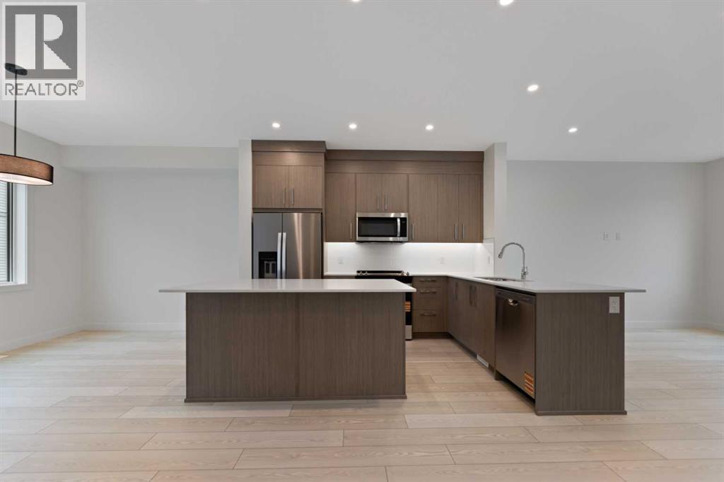 Welcome to 1870 Cornerstone Boulevard – a modern and stylish townhouse offering 4 bedrooms, 2.5 bathrooms, and an attached double heated garage. With over three thoughtfully designed levels, this home blends luxury, functionality, and convenience in one of Calgary’s most sought-after communities. Step inside to discover luxury vinyl plank flooring, soaring ceilings, and a chef-inspired kitchen featuring full-height cabinetry, elegant quartz countertops, and premium stainless-steel appliances. A flexible main-floor bedroom provides the perfect space for a home office or guest suite. On the second level, you’ll find another beautifully appointed kitchen complete with a large island for added prep space, soft-close cabinets and drawers, and access to a road-facing balcony — perfect for morning coffee or evening relaxation. The spacious adjacent dining area is ideal for entertaining, and a stylish two-piece powder room adds everyday convenience. The third floor is a private retreat, featuring a generous primary suite with a walk-in closet and a luxurious ensuite bathroom. Two additional bedrooms, a full bathroom, and a convenient upper-level laundry room complete this level. Located in the vibrant community of Cornerstone, this home offers unbeatable access to major roadways including the Airport, Stoney Trail, Metis Trail, Deerfoot Trail, and Country Hills Boulevard. Residents enjoy proximity to schools, shopping, parks, and all essential amenities. Don’t miss your chance to own this stunning, move-in-ready townhouse. (id:6289)