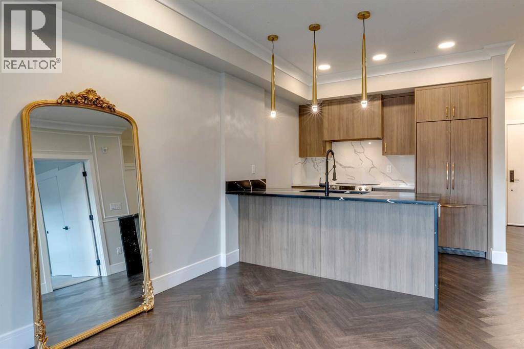 Welcome to the "VERDE" in Quesnay at Currie by Rohit Homes – a stunning 1 Bed + Den suite offering intelligently designed living in Calgary’s vibrant inner city. Featuring soaring 10’ ceilings, luxury vinyl plank flooring, and designer finishes curated by Louis Duncan-He, this home perfectly blends style and function. The open-concept layout includes a spacious kitchen with quartz countertops, ceiling-height cabinets, an elongated island, and stainless steel appliances. The central dining space flows seamlessly into the bright living area, while the den offers a flexible space for a home office, gym, or hobby room. Relax in the well-appointed primary bedroom, and enjoy warm summer evenings on your private balcony with a natural gas BBQ line. Additional highlights include in-suite laundry, secure underground parking, bike storage, and access to landscaped grounds and pathways. Built Green® certified, pet-friendly, and located minutes from downtown—Quesnay at Currie is urban living redefined. (id:6289)