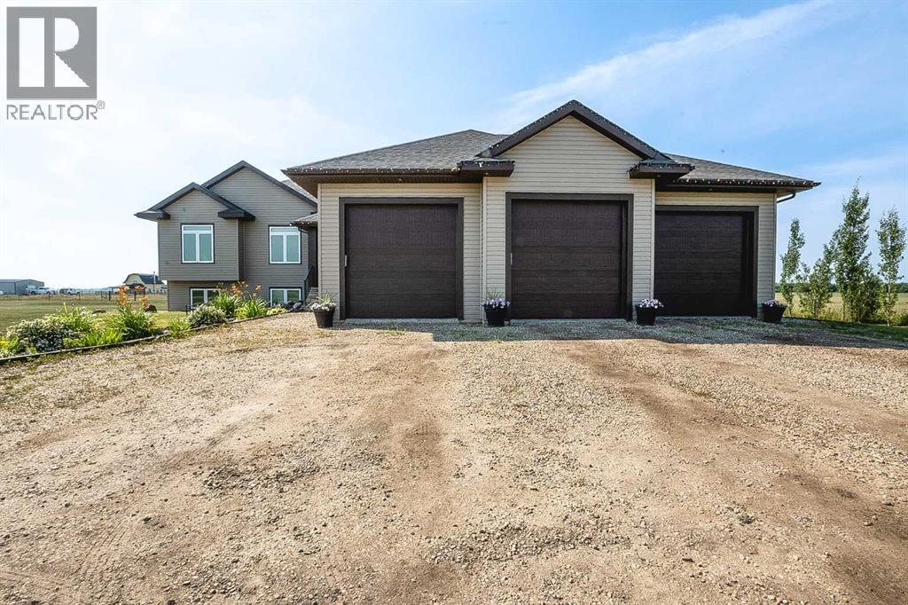 This Immaculate, elegant, and like new BUNGALOW acreage will be sure to wow all! Boasting a massive heated attached 32x42 garage, situated on 4.93 acres with the desired zoning of CR-5! Hosting an abundance of space with 6 BEDROOMS and 3 FULL BATHROOMS WITH MAIN FLOOR LAUNDRY! Lets head on inside your new beautiful home, that welcomes you with grande tiled entrance that flows into your living room with tall coffered ceilings. Off the living room you will find a spacious dining room, that leads you into your show home like kitchen. Kitchen hosts ample cabinet + counter space, granite counter tops, double wall ovens, and commercial sized fridge + freezer combo. Main floor laundry, around the corner from the kitchen as well as a must have boot/mudroom into your garage. The remainder of the main floor consists of the large master bedroom, walk in closet, an oasis of an en-suite with walk in shower, and soaker tub. Two more bedrooms and full bathroom. Navigating to the fully finished basement that hosts large windows allowing natural light in all day long. Basement consists of 3 more bedrooms, full bathroom with dual sinks, family room, rock climbing wall, and another entry way to your garage. Attached garage is heated with drive a through bay door, floor drains, and a finished cold room to store all your preserves and vegetables. Deck is nice, private and partially covered with natural gas plumbed in for your BBQing needs. Heading outside you will find a firepit area great for entertaining, a heated above ground hard walled 21ft pool that can stay up all year round, a red barn with power and gas lines ran to it, and a chicken coop. Garden boxes, greenhouse and garden area wonderful for all the green thumbs out there. Also do not worry you will beat the heat for the remainder of summer/fall as this home has CENTRAL AIR! New chlorination filter set up in 2024. Note the home was custom built by original owners with added perks such as triple pane windows, home surround sys tem throughout, and high efficiency insulation. Book your viewing today as this home will be sure to check all the acreage living boxes. (id:6289)