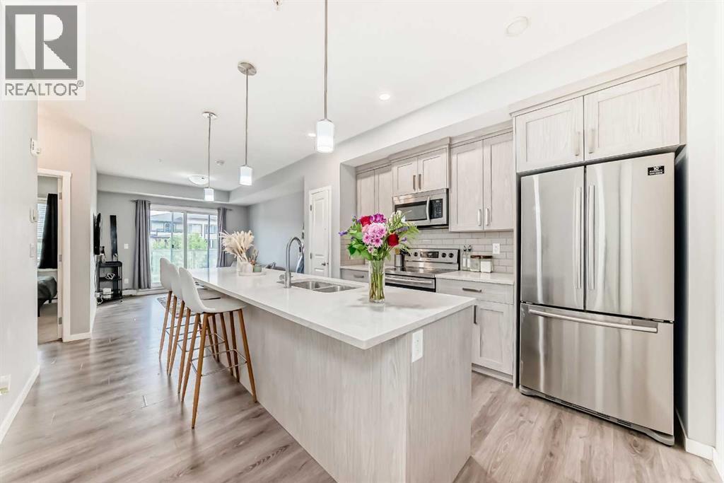 Welcome home to this beautiful condo in the popular & convenient community of Seton!  This contemporary 1-bedroom, 1-bathroom unit features a well appointed kitchen with stainless steel appliances, gleaming quartz counters and a huge island with space for seating, a dedicated pantry, tall kitchen cupboards and hanging pendant lights.  You will love the open concept living as the eat-in kitchen connects you to the spacious living room making entertaining guests a pleasure. There is also a private south-facing balcony which brings in lots of natural light. The generous sized bedroom also has a walk-in closet.  Directly across from the bedroom is a lovely 4-pc bathroom. You will also have the convenience of a large in-suite laundry room with tons of additional storage. One underground titled parking is included along with a separate storage room also located underground.  This building is PET FRIENDLY with board approval. Seton offers many amenities including Calgary’s newest hospital, the South Health Campus, Calgary Public Library & the world’s largest YMCA. Other amenities include restaurants, grocery stores, schools, Cineplex and community parks! Do not miss your chance to make this gorgeous condo in an ideal location your next home! (id:6289)