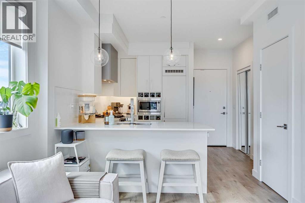 Modern Corner Unit in West District | Tenant in Place – Turnkey Investment Opportunity Welcome to Unit 402 at the Mondrian – a bright, modern corner unit in the award-winning West District community of West Springs. With a tenant already in place for the past two years, this is a perfect turnkey investment opportunity in one of Calgary’s most sought-after urban developments. This 1-bedroom + den, 1-bathroom air-conditioned home features 9’ ceilings, luxury vinyl plank flooring, and expansive NW-facing windows that flood the space with natural light. The open-concept layout is anchored by a chef-inspired kitchen with quartz countertops, upgraded stainless steel appliances (including gas cooktop), and a generous island—ideal for both everyday living and entertaining. Situated steps from boutique shopping, top restaurants, cafes, fitness studios, and green spaces, and just 15 minutes to downtown or a short drive to the mountains, this location balances lifestyle and convenience. Whether you're looking to grow your real estate portfolio or secure a stylish home in a thriving community, this modern corner unit with stable rental income checks all the boxes. Contact us today to schedule a viewing and learn more. (id:6289)