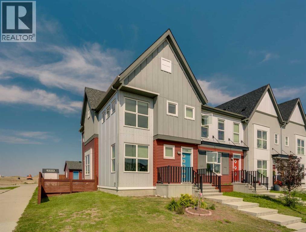 END-UNIT 4-BED TOWNHOME ON A CORNER LOT W/ FINISHED BSMT, DBL GARAGE & NO CONDO FEES IN LIVINGSTON! Welcome to 156 Livingston View NE — a rare end-unit townhouse on one of the largest lots on this street, just steps from the Livingston Hub! Featuring a giant low-maintenance backyard, double garage, and fully finished basement, this home offers more leg room in every way — more living space, more yard space, and more parking space. Plus, no condo fees, air-conditioning & over 2000+ SQFT of developed living space provide you with unbeatable value! Step inside and you’re greeted by a bright foyer with storage and sightlines into the open-concept main floor. The living room sits at the front of the home, filled with natural light from oversized South-facing windows. At the centre of the main floor, the dining area offers plenty of space for family dinners or hosting friends. Further in, the kitchen impresses with Quartz countertops, stainless steel appliances, shaker-style cabinetry, and a unique herringbone backsplash for that extra warmth — plus a window over the sink to look out at your backyard. A rear mudroom opens onto a back deck & a fenced yard, low-maintenance stone patio, garden beds, and plenty of room for those summer BBQs. Back inside, a 2pc powder room for guests completes this level. Upstairs, the primary suite comes with its' own set of perks including a walk-in closet and a 3-piece ensuite featuring a glass shower. Two additional bedrooms and a full 4-piece bath are down the hall, along with the convenience of upstairs laundry. The fully finished basement adds incredible flexibility. A large rec room is perfect for movie nights, a home gym, or a play area. There’s also a 4th bedroom and another full bathroom — ideal for guests, older kids, or a private home office. Outside, this property sits on a massive corner lot, with a backyard space most townhomes can’t match — plus a double detached garage adds secure parking and extra storage. Down the block, y ou'll find the Livingston View Pond & Livingston Hub - one of Calgary’s premier community hubs. The 35,000 sq ft recreation centre is exclusive to Livingston residents, featuring outdoor rinks, splash park, tennis courts, gym, amphitheatre, daycare spaces, banquet facilities, summer camps and more. Access to the rest of the city is easy with several nearby major roadways including Stoney Trail, Harvest Hills Blvd, & Deerfoot Trail. Jumping in the car: Downtown is a 22 min drive (25.7KM), Airport is a 12 min drive (14.7KM), & Banff is a 1hr 20 min drive (132KM). (id:6289)