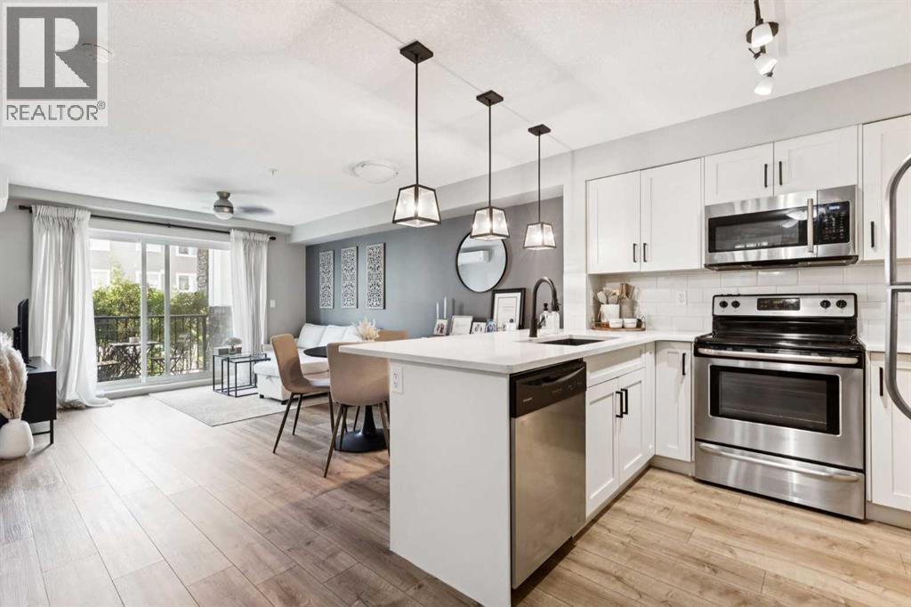 Welcome to Sage Place Unit #3103, where 581 sq ft feels remarkably spacious! This bright and inviting open floor plan is enhanced by a large NE balcony door, flooding the unit with natural light. Enjoy a sophisticated living experience with modern finishes, including upgraded lighting and hardware, elegant quartz countertops, and custom blinds in the primary bedroom. The tiled bathroom floor adds a touch of luxury, while the versatile flex space at the front entry offers additional functionality.The peninsula island not only provides ample prep space but also serves as a stylish seating area for hosting. You'll have the flexibility to create a dedicated dining area or expand your living room for even more comfort. Stay cool during the warm months with air conditioning—perfect for those 28 days a year when it's truly needed! The primary bedroom is generously sized, featuring a spacious walk-in closet and convenient access to the main bathroom. The double balcony, surrounded by mature landscaping, offers a rare sense of privacy and feels surprisingly expansive—an exclusive feature of the main floor units. Plus, your parking space is just steps away, located less than 10 feet from the balcony and positioned directly in front of the unit. With only one common wall, this unit provides a serene living environment. Don’t miss your chance to experience modern living at its finest in this stunning unit! (id:6289)