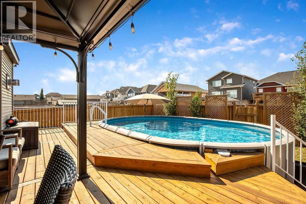 Welcome to 2033 High Country Rise NW – a beautifully designed executive 6-bedroom home offering a unique “master up” floor plan and an incredible lifestyle inside and out. The main floor is open and bright, featuring vaulted ceilings and gorgeous hardwood laminate plank flooring throughout. The chef-inspired kitchen boasts a massive island, granite countertops, wall pantry and abundant cabinetry; flowing seamlessly into the dining area with its striking board-and-batten feature wall. The inviting living room showcases a cozy gas fireplace and expansive west-facing windows leading to the raised deck and above-ground pool. The main floor also includes two generous bedrooms, a 3-piece bath, and a convenient laundry room with sink. Upstairs, the private primary suite offers a retreat of its own, with a huge bedroom, east-facing windows for morning light and a luxurious 5-piece ensuite. The fully finished lower level provides a large family room with fireplace, three additional bright bedrooms and excellent storage. Step outside to a show-stopping yard designed for both relaxation and entertainment. Outdoors, this home truly shines. The custom wood decking surrounding the pool, along with a fully fenced and landscaped yard, creates the perfect private oasis. The hardscaped front yard enhances the curb appeal, while the double garage adds function. Located close to schools, pathways, parks, golf and easy highway access; this home blends comfort, style, and convenience. A must-see for families seeking both space and lifestyle! (id:6289)