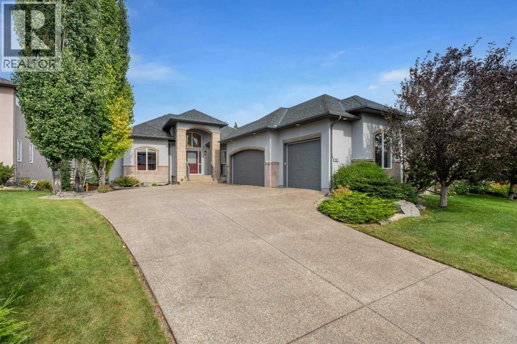 Welcome to this exceptional estate residence in the prestigious community of Aspen, perfectly situated on a beautifully landscaped 8,471 sq. ft. lot that offers privacy, mature trees, and no homes directly behind. This immaculate bungalow showcases timeless craftsmanship with over 4,600 sq. ft. of living space, thoughtfully designed for both everyday comfort and elegant entertaining. From the moment you arrive, the home makes a statement with its oversized triple garage, a newly refinished driveway with ample room for additional parking, and stunning curb appeal that sets the tone for what’s inside. Step into the main level where soaring vaulted ceilings and expansive windows create a bright, airy atmosphere that is both warm and inviting. The open floor plan flows seamlessly between the living, dining, and kitchen areas, highlighted by a large deck that extends the living space outdoors and overlooks the lush, private backyard. A spacious front office with a nearby 4-piece bath provides the ideal work-from-home setup or easily functions as a second main-floor bedroom. The primary retreat is tucked away for privacy and comfort, featuring a generous 5-piece ensuite with dual vanities, a separate soaker tub and shower, and a private water closet. A large laundry and mudroom with sink adds practicality, while the thoughtful layout ensures convenience throughout. The professionally developed walkout basement nearly doubles the living space, offering a massive recreation and games room perfect for family gatherings or entertaining guests. Comfort is paramount with two dedicated in-floor heating zones—one for the bedroom wing, which includes two spacious bedrooms and a 4-piece bathroom, and another for the expansive recreation space. A freshly sealed lower-level patio opens onto the meticulously maintained backyard, where mature landscaping, newer fencing, and carefully designed outdoor spaces create a peaceful oasis. Additional highlights of this home include central air conditioning for year-round comfort, a water softener, built-in central vacuum with attachments, and abundant storage space. Every detail reflects the pride of ownership and meticulous care that has gone into maintaining this home. Combining an enviable location in Aspen’s sought-after estate area with a rare blend of space, privacy, and elegance, this residence offers a truly unique opportunity to own a forever home in one of Calgary’s premier communities. (id:6289)