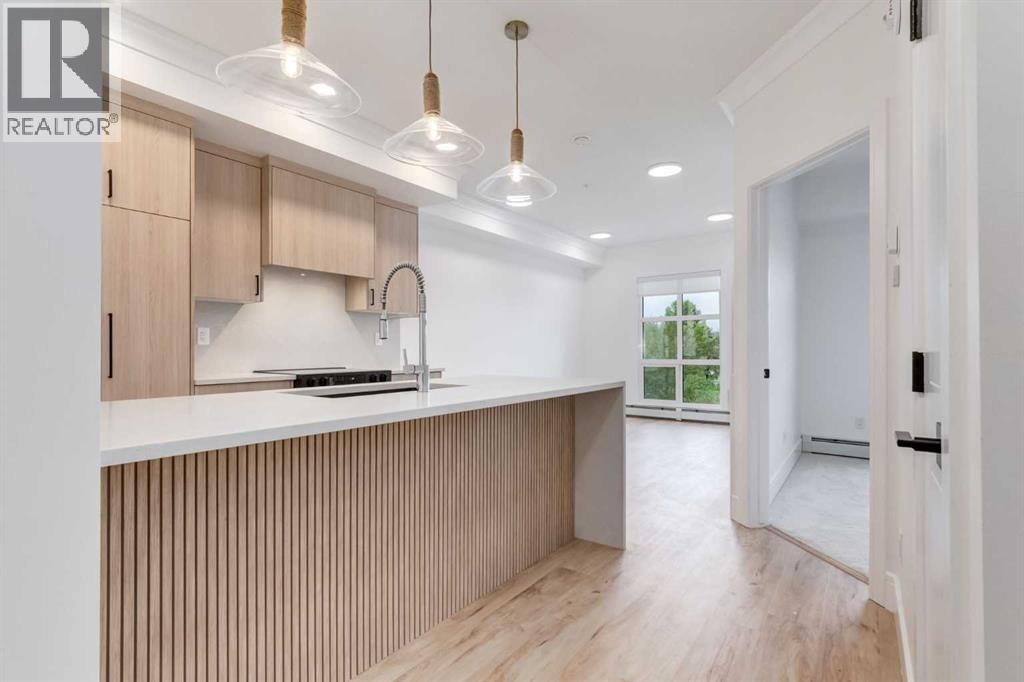 Experience boutique luxury with the Ambra model, a meticulously crafted 643 sq. ft. residence featuring 1 bedroom plus a versatile den. Designed with the serene Ethereal Zen palette, this home combines soft, calming tones with natural textures, creating a tranquil, elevated living environment.An open-concept layout is framed by a striking transient window, flooding the space with natural light and showcasing breathtaking downtown views. The chef-inspired kitchen features sleek, full-height cabinetry, quartz countertops, and premium finishes, blending elegance and functionality in every detail.The primary bedroom serves as a serene retreat, while the flexible den is ideal as a home office, private reading space, or guest room. A spa-inspired 4-piece bathroom completes the home, offering a refined touch to daily living.Perfect for those seeking a sophisticated home with panoramic city vistas, the Ambra model delivers a boutique lifestyle where luxury and design meet in perfect harmony.This pet-friendly and AIRBNB-friendly building offers titled heated underground parking and plenty of visitor spaces. Ideally located minutes from downtown, Mount Royal University, and the vibrant amenities of 17th Ave and Marda Loop, the Argento floorplan is a rare gem. Limited units are available—secure your slice of modern living today! **Photos are taken from existing building of the same models. Not of the exact unit ** (id:6289)
