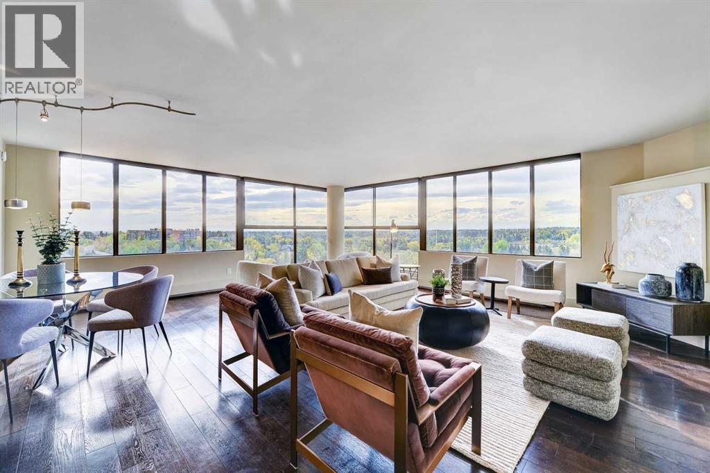 VIEWS! VIEWS! VIEWS! Your “Nest in the Sky” Awaits. Step into luxury in this exquisite sub-penthouse boasting breathtaking panoramic views of the River Valley, the majestic Rocky Mountains, and Calgary’s shimmering City Skyline. Prime Location Ideally situated in the heart of MISSION. Enjoy a short STROLL to vibrant 4th Street with it's cafes & restaurants, the prestigious Glencoe Club, and the scenic River Pathway System. This is inner-city living at its finest with Sun-Drenched Sophistication.The OPEN CONCEPT layout is bathed in natural light from expansive WEST and SOUTH-facing walls of windows. From the Living Room, Dining Area, and Kitchen, enjoy stunning vistas at every turn. The Kitchen offers easy entertaining featuring Island Breakfast bar, Stainless steel appliances + Walk-In Pantry. Rest and Recharge in the spacious Primary Bedroom which accommodates a king-size bed, complemented by a walk-in closet and a 4-piece ensuite. DAY & NIGHT, the downtown views create a truly magical ambiance. Flexible Living Space offered by the charming Second Bedroom with a custom Murphy bed + Bookshelves. In-unit Laundry and dedicated Office space, provide versatility and comfort for modern lifestyles. Outdoor Bliss is yours withone of the RARE private terraces in the building, complete with awning. The perfect sanctuary for your morning coffee or sunset cocktails — all framed by SOUTH & WEST mountain, river and skyline views. Convenience at Its Best Includes Two Titled, underground parking stalls (Side by Side) and an assigned storage locker. Riverstone is a prestige, meticulously maintained building, which features an Exceptional roster of Amenities: 24/7 Concierge & full-time Building Manager, Indoor pool with Hot tub & Saunas, Tennis Court, Fully-equipped Fitness, Library/Games room & Party Lounge with Kitchen, Heated Underground Visitor Parking & Car Wash Station, plus a Strong reserve fund and professional management. Live Where Calgary Comes Alive! Nestled in one of the city’s most desirable communities. (id:6289)