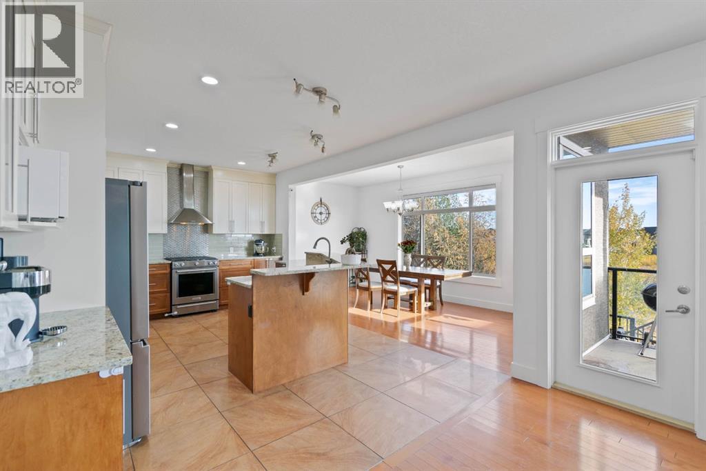 Luxury Walkout Home Backing Onto a Pond — Steps From School, Park & Shops!Prepare to be impressed by this beautifully designed 2725 SQFT walkout home, perfectly situated on a large lot backing onto a serene pond and lush green path and across from East Lake School. With a thoughtful layout, elegant finishes, and a family-friendly location, this home strikes the perfect balance between luxury and comfort.From the moment you walk in, you’ll notice the attention to detail everywhere — from the spacious tiled foyer to the 9-foot knockdown ceilings and rich hardwood floors that flow throughout the main level. French doors open to a bright main floor den, ideal for your home office or study.At the heart of the home is a chef’s kitchen designed to impress. Featuring custom two-tone cabinetry, granite countertops, a large central island with seating, and stainless steel appliances, including a gas range and professional hood fan, this kitchen is both beautiful and functional. The glass-front cabinets and walk-in pantry complete the space with flair.From the dining area, step out onto your massive vinyl deck with glass railings, where you can take in peaceful pond views — the perfect setting for morning coffee or sunsets. The stairs lead to a fully landscaped backyard, offering plenty of space for kids and pets to play.Upstairs, you’ll find four spacious bedrooms, including a luxurious primary suite with vaulted ceilings and picturesque pond views. The spa-inspired ensuite includes double granite vanities, a large soaker tub, a separate shower, and heated tile floors (also found in every bathroom!). A bonus room and stylish 5-piece main bath complete the upper level — perfect for family movie nights or a homework zone. No carpet anywhere — just elegant hardwood , tile and vinyl plank throughout, combining luxury style with easy upkeep.The fully finished walkout basement extends your living space with a bright family room, recreation area with a wet bar, 5th bedroo m, and full bath — with potential for a 6th bedroom if desired. Oversized windows bring in natural light and connect you to your private backyard retreat.This home is thoughtfully equipped with energy-efficient solar panels, reducing monthly utility costs while contributing to a more sustainable future. Additional highlights include a finished double garage and enclosed storage under the deck. (id:6289)