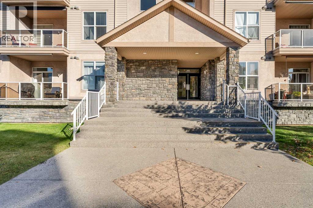 Imagine living a quiet simpler life in downtown Okotoks. This spacious 1,058 sq. ft. 2-bedroom plus den condo offers comfort and style under 9-foot ceilings with in-floor heating throughout. Pets are welcome (dogs up to 25 lbs, with board approval). Meticulously maintained, the unit features numerous upgrades — including paint, new Luxury Laminate Plank flooring, modern light fixtures, updated door hardware, kitchen sink, bathroom fixtures, new blinds, and ceiling fans: two oversized bedrooms and two 4-piece bathrooms. Naturally illuminated by four windows, the primary bedroom connects to a private ensuite through a walk-through closet. The bright, open kitchen offers plenty of white cabinetry and modern quartz countertops, overlooking a spacious dining area and a warm, welcoming living room that easily fits full-sized furniture. A Kinetico water filtration system provides cleaner, great-tasting drinking water. Step outside through the sliding patio doors to your west-facing covered deck — complete with a sun shade and a gas hookup for your BBQ and convenience with a heated underground parking stall (#15) located near the elevator. You will not find a more beautiful and more spacious unit for this fantastic price in all of Okotoks. Call your favourite realtor now to book your showing. (id:6289)