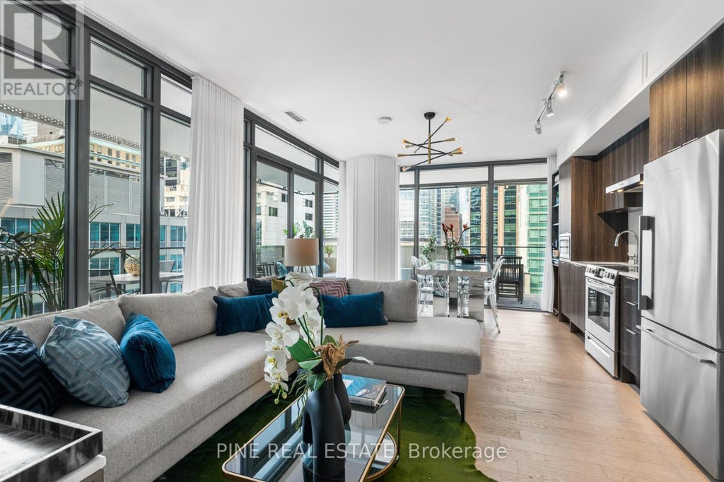 Can't Be Young and Rich? Then, live there. Welcome to YONGE+RICH Condos by Great Gulf. Suite 1305 offers 1400sqft of meticulously curated space that creates a truly one-of-a-kind urban oasis in the heart of downtown Toronto. Perched on the SW corner of the 13th floor is this inviting 894 SQFT 2 Bed, 2 Bath + Den Corner Suite. The "Dalhousie" layout is the flagship floor plan, which boasts the LARGEST interior AND exterior spaces, illuminated by natural light with 8'6" Floor-To-Ceiling windows. Professionally designed and decorated, this suite is truly 'RICH' with emotion and thought but still YONGE at heart. Every detail has been thoughtfully elevated. Large stone countertops throughout the suite clad the touch surfaces. Wainscotting wall panelling wraps every room. Clean matte black-trimmed mirrored sliding closet doors and gold hardware throughout add bold and sophisticated. Custom-built-in shelving has been added to every room, offering both form and function. The den is enclosed with a striking black, custom loft-style steel partition and features a mirrored wall perfect for a stylish home office, third bedroom, or dining area. The kitchen is sleek and functional with stainless steel appliances. Both bathrooms are spa-like retreats. All bathrooms feature a waterfall-edge vanity and glass partition. The 3-piece guest bath is wrapped in Brazilian nature-inspired art photography printed on wallpaper, creating a grounded sense of being in nature. Each space in the home has been crafted to evoke a unique emotion and personality, luxurious, calming, vibrant, or bold. Step out onto your calming, zen-inspired 506 sqft southwest-facing wraparound balcony, with southwest exposure, which is truly an extension of your living space. With distinct areas for lounging, dining, & entertaining while soaking in city views. Includes 1 parking space + 2 lockers. This is downtown living reimagined with soul, intention, and a level of detail rarely seen. See it before it's gone. (id:6289)
