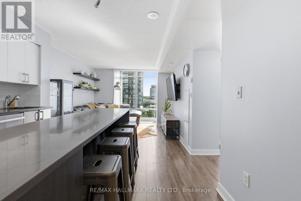 Live the Island Life...the kitchen island life that is! If you're looking for an elevated one bedroom plus den unit with all of the extra's, then look no further. If you're not, you'll find plenty of mediocre options nearby but you won't be as happy. Recently updated, this spacious unit features a renovated bathroom, newer flooring throughout and an updated kitchen with premium appliances that include a flat cook top (for all of you aspiring Chef's) as well as a stunning over-sized kitchen island with plenty of space to prep your culinary masterpieces and entertain guests while you're doing it. Yes, you could find yourself featured on the hit show, Come Dine With Me (Canada)! If you don't like to cook, Uber Eats tastes that much better on gorgeous quartz counters in a space like this. You've got lots of storage throughout and a built-in Murphy bed in the den (which also includes a closet and features an actual door) makes hosting guests a breeze while simultaneously making the most out of the space as an office, lounge area or exercise room when you're not hosting. A sunny west exposure delivers great natural light across the space and fantastic building amenities mean you can finally give up your membership at GoodLife. Superb location - everything you need is a short walk away, including the TTC and Gardiner, for those times you just need to get out of Toronto. Getting to the lake shore is a breeze as well; should you want to get to an actual island, the Centre Island water taxi's are a quick stroll south. Don 't sleep on this one - she won't last long! (id:6289)