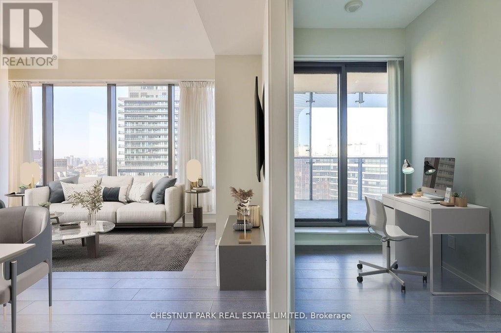Historic facade welcomes you to this stunning southwest corner unit in the heart of downtown. Sun filled open airy living space with soaring 9ft ceilings, floor to ceiling windows & light coloured design palette. Extra large balcony with unobstructed panoramic views of the city skyline and spectacular sunsets. Never tenanted this unit is meticulous & spotless. Den has walk out to private balcony & can easily be a second bedroom. Primary suite has luxurious ensuite & double closet. The open kitchen High end Miele integrated appliances and the large extended island acts as a dining table. Owned STORAGE LOCKER & parking space. Superlative amenities include numerous lounge areas to chill out as well as peaceful work areas & library. Incredible gym, yoga room, billiards, hot tub, steam room & sauna. There is also a party room with fully equipped kitchen, piano room & stunning rooftop deck with BBQ's. Easy dog washing! The building is pet friendly with a Pet Care room. This unbeatable location is just steps to U of T, Metropolitan University, Yorkville, Financial district, Eataly & numerous shops & dining options. Commuting is a breeze with Wellesley & Museum station minutes away. 4 dedicated elevators so no wait times. Well managed building with new fob to floor security & low maintenance fees. Guest suites, 24 hour concierge & visitor parking. This is the picture perfect urban condo! (id:6289)