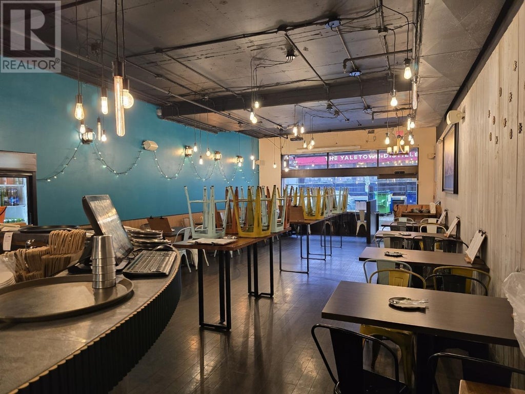 Exciting chance to acquire a restaurant in Yaletown. Nestled amidst vibrant residential and office complexes near the Canada Line, this establishment boasts a fully-equipped commercial kitchen and liquor license, catering to both lunch and dinner crowds. Seating up to 60 guests (1532 sqft), the space offers ample opportunities for a new owner. New owner can keep the current concept or can easily turn it into any other type of restaurant. 6ft commercial vent / grease trap PLS DO NOT DISTURB STAFF Call listing agent for showing. (id:6289)