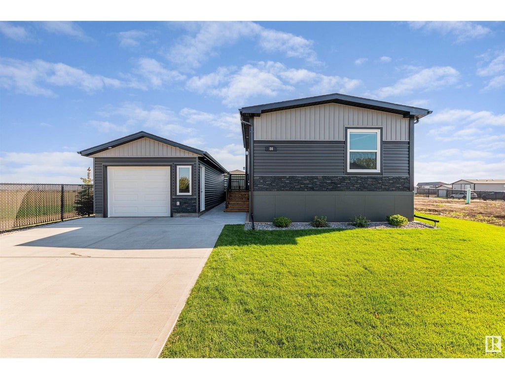 NEWER 4 BEDROOM MANUFACTURED HOME!! Discover the newly built 2024, 4-bedroom home, featuring 4 generously sized bedrooms and 2 bathrooms. Located in the tranquil Meadows of Morinville, this property offers privacy and picturesque views next to a walking trail. The home features an open-concept layout with a living room, dining area, and a spacious kitchen complete with ample cabinets, countertops, a walk-in pantry, and stainless steel appliances. The living room is enhanced by a vaulted ceiling and an oversized window that amplifies its spacious feel. The primary bedroom includes a walk-in closet and a 3-piece ensuite with a step-in shower and large vanity. Conveniently located nearby are the laundry room and the second bedroom. At the opposite end of the home are two additional sizable bedrooms and a4-piece bath. Outside, a large deck overlooks the walking trail and offers views of stunning sunsets. The property is landscaped and includes an oversized single garage. You don't want to miss this one! (id:6289)