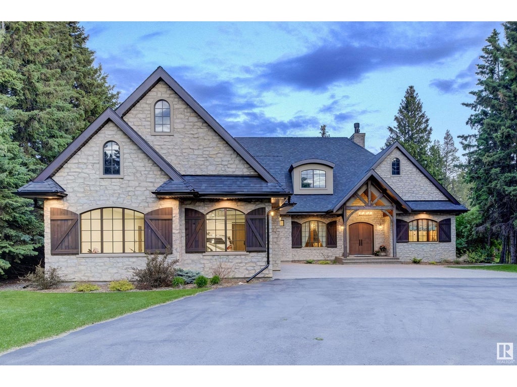 Reminiscent of the stone farmhouses of Burgundy France, experience elegant modern living paired w/ historical charm & exquisite European influence in a private, picturesque setting w/ this one-of-a-kind, executive estate bungalow, nestled on two meticulously landscaped acres in Sturgeon County, mere minutes from both Edmonton & St. Albert. Crafted by Heredity Homes & designed by Nadia Li of Go For Décor, this home blends historical charm w/ modern comfort. Exterior features include natural stone walls & Douglas Fir beams, while inside, smoked white oak floors, wrought iron details, & Belgian linen window treatments create a luxurious ambiance. A centerpiece wood-burning fireplace & vaulted ceilings add grandeur, complemented by a gourmet kitchen w/ Lacanche oven & Miele appliances. The primary suite offers a private deck & spa-like en-suite, while the finished basement feat. 2 bedrooms, sauna, media room, gym, & wet bar. Outside, a carriage house w/ living space & expansive views completes this property. (id:6289)