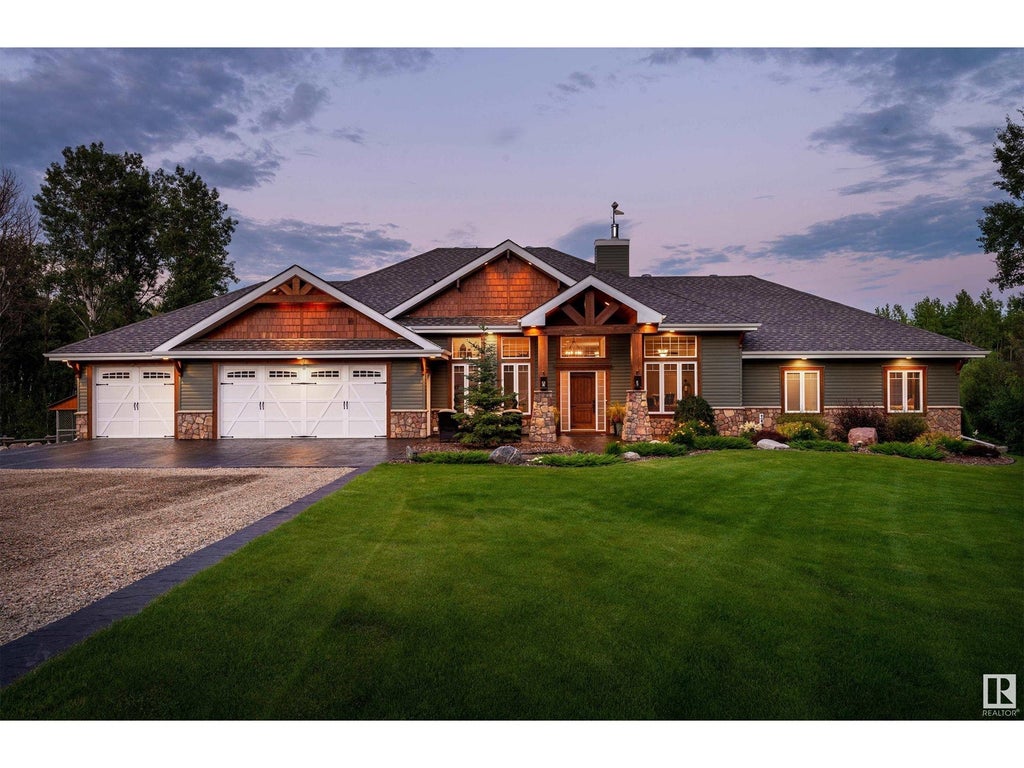Once in a lifetime a home like this presents itself to the market. A truly stunning & detailed estate awaits for you to experience and is sitting on a picturesque & private 39 acres in Sturgeon County. With over 2,900 sqft of living space, this ranch style bungalow exudes class, sophistication & charm with numerous entertaining areas. Some of the numerous upgrades include in floor heat in the home, newer boiler - washer/dryer & dishwasher, the o/s triple garage w/ oversized doors & the guest house, fireplace heating throughout the duct work in the main home, tankless hot water heater, 9 & 12ft ceilings which allow TONS of natural light, insulated interior walls, granite counters & high end appliances. The 30x30 guest home can easily be turned back into a garage & also features a 3pce bath, kitchen & its own septic tank. The 1,900sqft shop is meticulous & is the perfect set up for a business. All of this & so much more awaits you and your family. (id:6289)