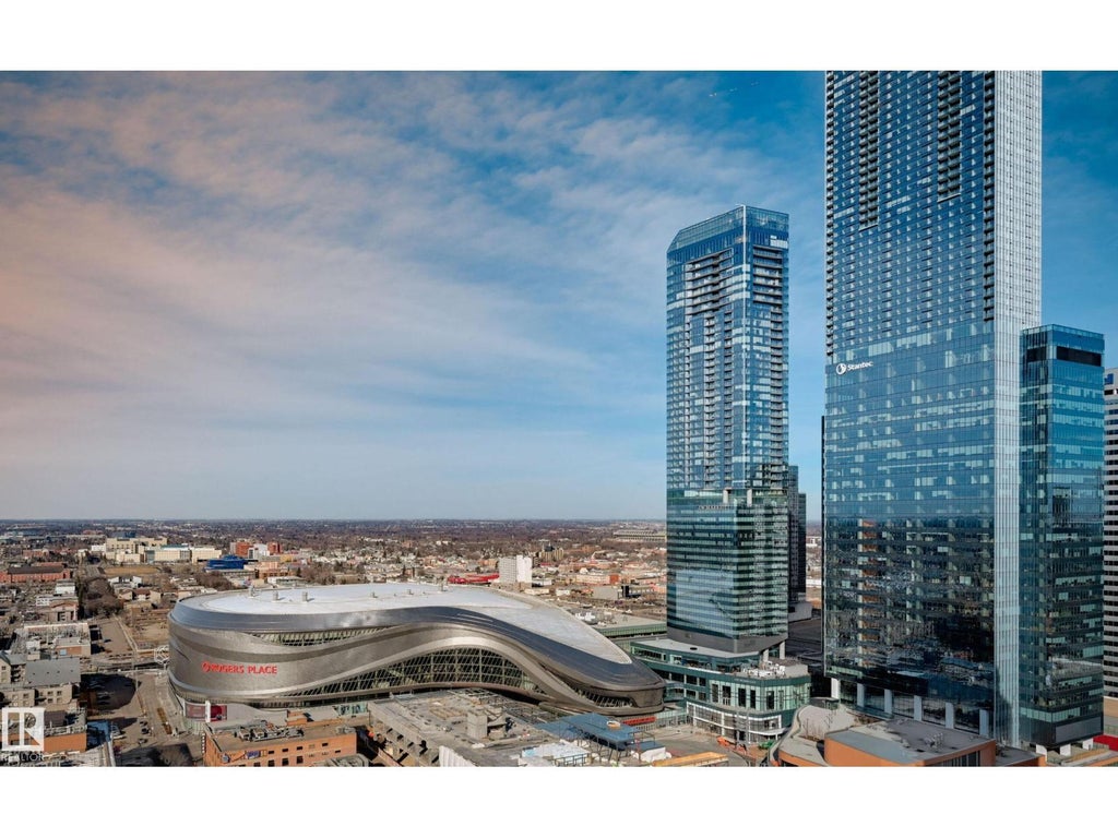Experience elevated urban living on the 41st floor of THE LEGENDS in Edmonton’s vibrant Ice District. This luxurious residence offers breathtaking panoramic views and refined modern finishes throughout. The sleek kitchen features white lacquer cabinetry, quartz countertops, and premium appliances. The thoughtfully designed layout includes two spacious bedrooms, each with its own ensuite, a versatile den or office, a stylish guest bathroom, and convenient in-suite laundry. Step outside to enjoy two private balconies. Residents enjoy access to 24-hour concierge service, Archetype gym, indoor pool, spa, and some of Edmonton’s finest dining—all just steps from your door. An unparalleled lifestyle in the heart of the city. (id:6289)