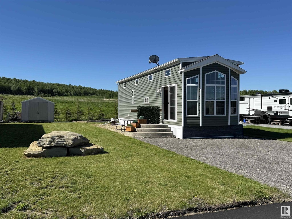 Welcome to this fantastic turnkey Park Model home located at the Trestle Creek Golf Resort which is only a 45 minute drive west from Edmonton. This charming well kept 1 bedroom 1 bath home is available for immediate possession and comes fully finished so just bring your personal items! You'll notice the new vinyl floors, 10 ft ceiling, lots of windows that allow on a ton of natural light, an electric fireplace, newer siding and skirting, a beautiful firepit area and a 10'x10' shed. It's what Trestle Creek offers is what brings people here to experience this unique 4 season lifestyle. The majestic scenery, golf course, the beach with waterslides, lazy river run, canoeing, fishing, pickleball courts, hiking/biking trails, sports fields and so much more!!! This is a wonderful and affordable opportunity to live a resort lifestyle whether it's just for a weekend getaway or perhaps all year round. (id:6289)