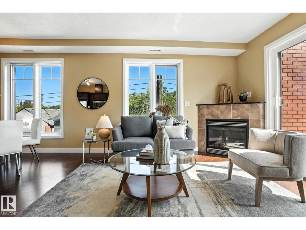 Welcome to University Properties, a classic brick-faced, low-rise concrete and steel building offering premium living just steps from the University of Alberta. This bright corner unit on the third floor features two bedrooms, two full bathrooms, 9’ vaulted ceilings, in-suite laundry, and central A/C. The open-concept layout includes a chef’s kitchen with stainless steel appliances, granite countertops, a breakfast bar, and a stylish mix of hardwood and ceramic tile flooring. Large Low-E windows fill the space with natural light. Relax by the cozy gas fireplace or on your private balcony with wrought iron detailing, a gas BBQ hookup, and tranquil green views. This pet-friendly building (one pet under 10kg with board approval) is known for its solid construction and soundproofing. Condo fees include all utilities except power. Enjoy easy access to U of A, Whyte Ave, the University Hospital, downtown, river valley trails, and the vibrant shops and cafés of Old Strathcona and the best schools in the city. (id:6289)