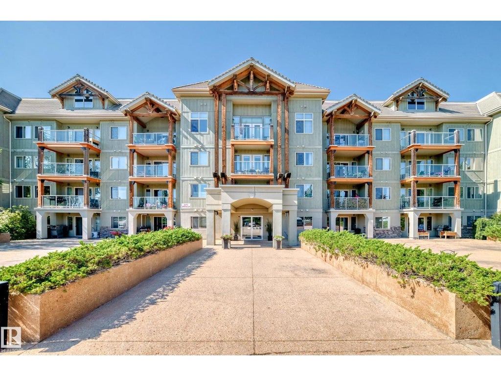 Welcome to The Lodge at Lewis Estates! This sought-after 30+ adult living complex feels like a mountain lodge retreat, complete with fitness centre, hot tub, steam room, party room, theatre, two rooftop patios, and a car wash — all just steps from the golf course. TIHIS UNIT FEATURES A RARE TITLED STORAGE UNIT! This main-floor condo offers 2 bedrooms and 2 bathrooms with a bright, open floor plan. The chef-inspired kitchen features Decorastone resurfaced granite countertops, abundant cabinetry, and a large island. The spacious bedrooms are separated by the living room, which opens to a west-facing covered patio with park views — the ideal spot to enjoy warm summer evenings. Highlights include a 3-pc main bath, 4-pc ensuite, in-floor heating, in-suite laundry, and storage. Complete with A titled parking stall very close to the elevators. Cats, birds & fish permitted with board approval (sorry, no dogs). Conveniently located near Transit, shopping, WEM, and with easy access to the Anthony Henday. (id:6289)
