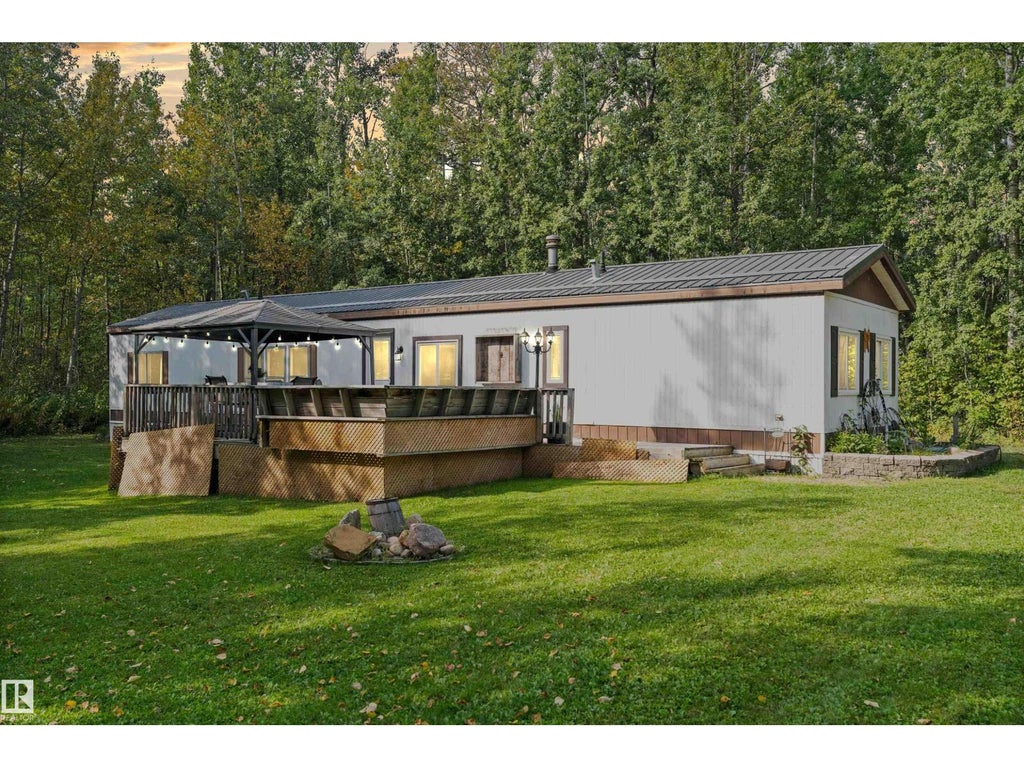 Welcome to your piece of paradise! This 3.01 acre parcel just 18 minutes west of Stony Plain offers fully treed privacy where you can build your dream home or enjoy as is. Situated beside an additional 2 acres of reserve land with no through roads, this location truly gets you away from it all. Large fire pit area and two sheds to store all you need to maintain the property. The long, private driveway has been built up and reinforced, and leads to the 3 bedroom/2 bath mobile home with large deck, built in seating area, fire tables and gazebo. Updates include NEW tin roof in 2021, HWT 2022, 2019 pressure tank, 2023 dishwasher and 2024 stand up freezer. Window updates have started as well! Home is on a bus route so winter snow removal is a priority. Directly north of Cougar Creek golf course, this property is a must see! (id:6289)