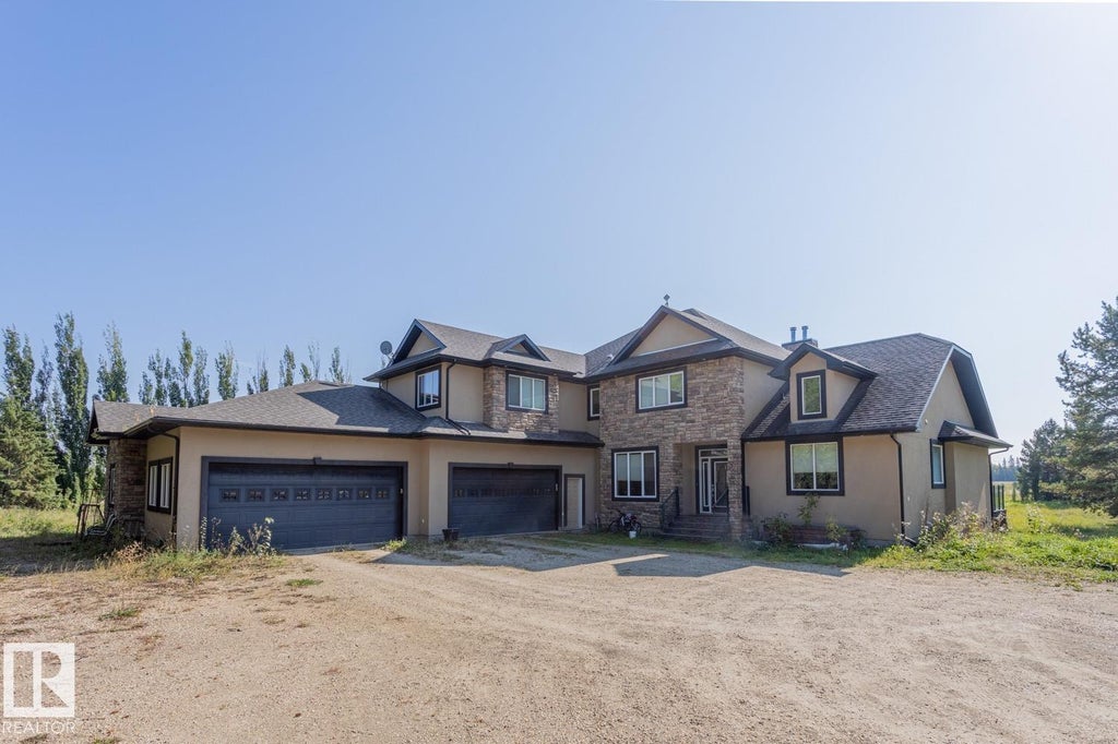 PROPERTY BEING SOLD AS-IS, WHERE-IS WITH NO WARRANTIES OR REPRESENTATIONS. Situated on 10.95 acres, this custom built 2-storey home offers 5 bedrooms and 5 bathrooms with a fully finished walkout basement. The living room showcases 21' vaulted ceiling, massive windows, a stone fireplace and a huge balcony. The kitchen includes cherry wood cabinets and granite countertops. The upper level features three bedrooms and a bonus room, while the main level includes the primary suite plus an additional bedroom. The walkout basement is finished to the same standard as the main floor with multiple large rooms, a wet bar, wood-burning fireplace, and access to the patio making it perfect for entertaining ADDITIONAL FEATURES: Heated quad garage (47'x32'), spacious heated shop, and storage shed. Convenient access to highways, and approximately 20 mins from west Edmonton. (id:6289)