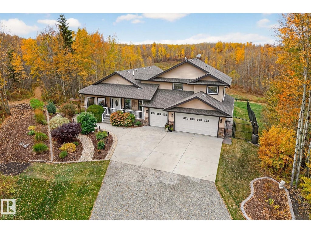 AMAZING 1.5 storey WALKOUT w/ triple att'd garage ( heated floors ) and 60x40 SHOP on a SECLUDED 21.33 ACRES just 25 minutes from Edmonton or Sherwood Park. This 2007-built 1952 sq ft (plus fully finished walk-out level) has been COMPLETELY RENOVATED w/ HIGH QUALITY UPGRADES! The main floor offers a bright living-room with gas f/p, dining area with deck access, a GOURMET KITCHEN w/new cabinetry, quartz countertops, eat-up island, high end appliances & fixtures, and a huge walk thru pantry! The main level is completed with a den, second bedroom, 4 pce bath & main floor laundry rm. Upper level consists of an INCREDIBLE PRIMARY SUITE w/ lrg walk-in closet and a GORGEOUS 5 PCE ENSUITE w/ HIGH END FINISHES! Walkout level is completely finished with 2 additional bedrooms, a 3 pce bath, storage rm, MASSIVE rec rm with F/P & patio access. Heated flooring thru-out lower level, garage, kitchen & bathrooms. Other features incl ICF foundation in both dwelling & shop, HI-velocity furnace & newer HIGH QUALITY Boiler. (id:6289)