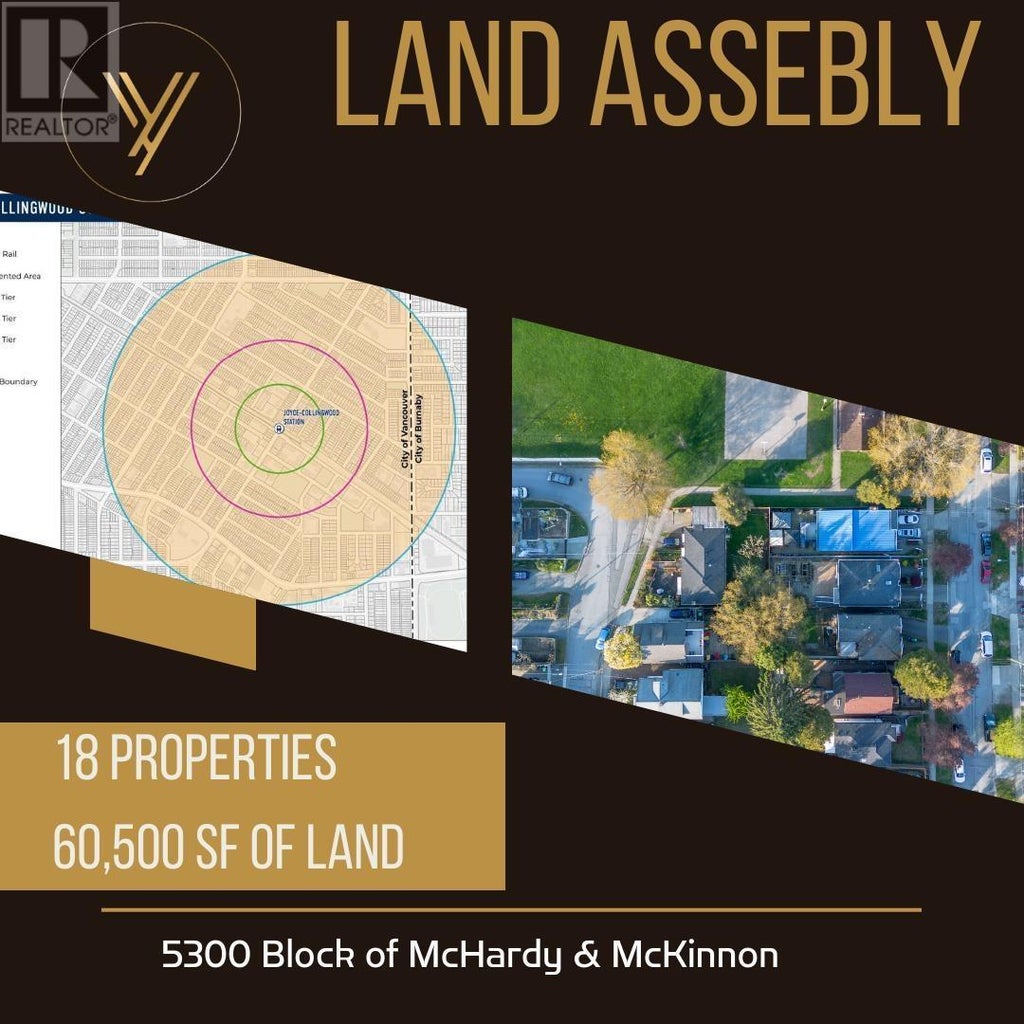 Land Assembly Alert! Attention Developers and Investors! Unprecedented opportunity to develop the entire 5300 block of McHardy Street AND McKinnon St with an impressive nearly 320 feet of frontage and 100 feet of depth. This land assembly consists of 10 Homes on McHardy st, and upto 8 homes on McKinnon st, for a total lot size of roughly 60,500 sf of land. This property is part of the Transit-Oriented Development Area around Joyce-Collingwood Station, within the 800-meter tier, and currently zoned for a 3.0 Floor Space Ratio (FSR). Located merely steps from the Joyce-Collingwood Skytrain station, it offers remarkable convenience, providing future residents with easy access to a plethora of local amenities. Additionally, its proximity to a park enhances its appeal with green space nearby. (id:6289)
