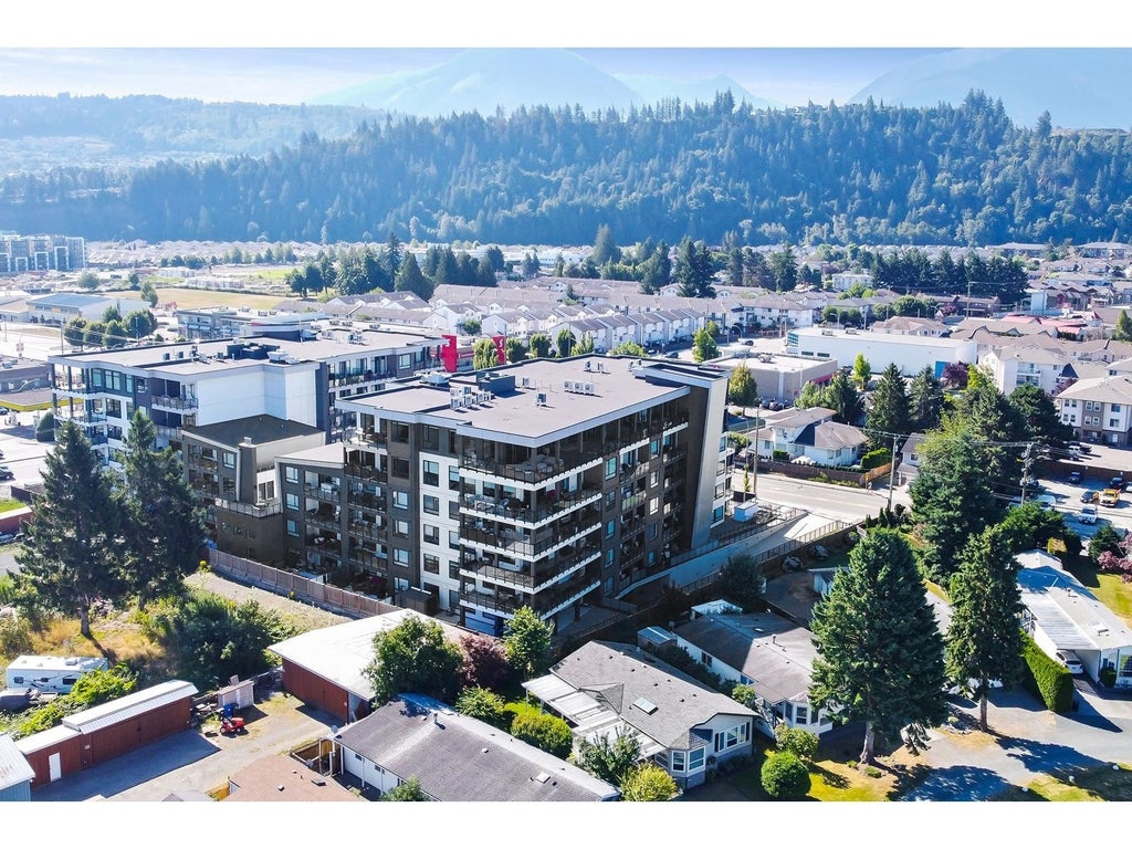 Welcome to refined living in this professionally designed 2-bed, 2-bath + den sub-penthouse, perfect for your next chapter. Thoughtful touches include crystal chandeliers, 11-ft ceilings, a warm, elegant colour palette, and an upgraded kitchen with custom pantry. Enjoy a walk-in closet that feels like a dressing room, a serene primary bedroom, power blinds on all windows, heat pump/AC, & stunning mountain views. With a secure EV charger dedicated to your parking spot, a vibrant community room and rooftop terrace with gas fire pits & BBQ, this move-in-ready home offers connection, comfort and ease in the heart of Sardis. Bike room, scooter charging, pet area, guest suite... Did we mention the stunning views and that we are on the quiet side of the building? Call your REALTOR today. (id:6289)