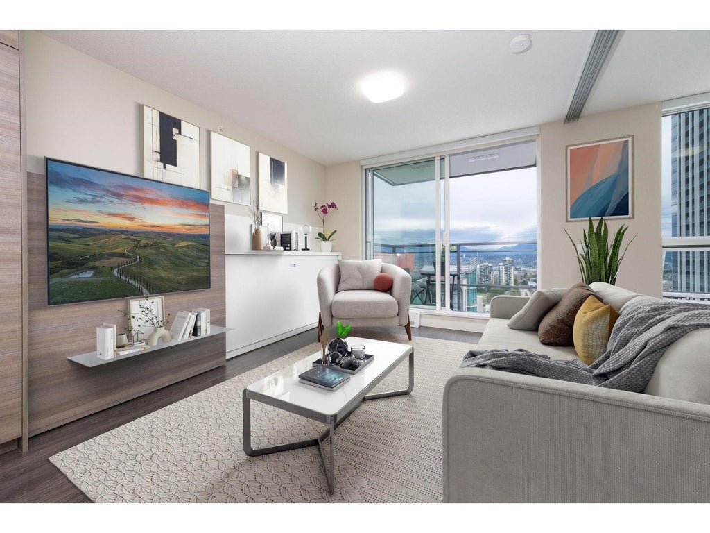 Move in now & enjoy Summer views of stunning North Shore Mountain & Fraser River from this exceptional suite! Built by BOSA, the Alumni building in the University District offers world class amenities and creative 'built-in' concept living. The kitchen island extends into a 8 person dining table, chairs included. Murphy bed, guest bed, movable TV stand, shelving... all included! Frosted panels separate the bedroom or can be hidden away for entertaining. Building hosts meeting & work spaces, gym, outdoor BBQ social area, and guest suite. Suite comes with P2 level parking & locker close together. Easy walking distance to shopping & transit. 34min train ride into downtown Vancouver! Ready to move in, no waiting! (id:6289)