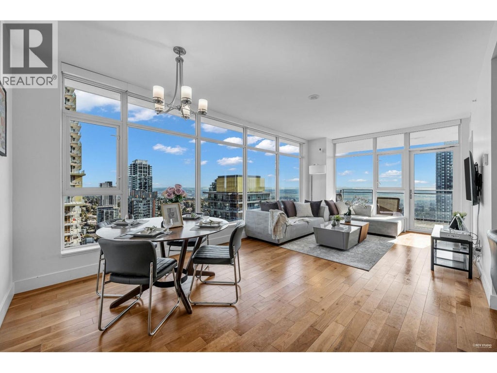Welcome to Modello, a landmark residence in the heart of Metrotown. This stunning south-east facing 2 brds plus 1 den home provide comfort and luxury, and the versatile den is perfect for a home office or guest suite. Offering an incredible 270 degree panoramic view of the water, mountains and city skyline. Expansive living spaces with floor-to-ceiling windows fill the home with natural light. Geothermal heating and cooling, Brushed walnut and oak hardwood flooring, a marble slab feature wall in the kitchen equipped with premium Miele appliances, wine cooler, pantry, Italian Fhiaba fridge. Step out onto your large balcony which is 150sqft, perfect for morining coffee and sunset wine. Indulge in first-class amenities with 24-hour concierge, fitness centre,5 star setting with a formal dining area, bar and catering kitchen, relaxing indoor hot tub and stylish lounge. Perfectly positioned within walking distance to Metrotown Mall, Skytrain, Restaurants, Central Park. 1 Parking &1 Storage Locker included. (id:6289)