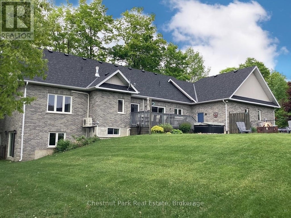 Tucked away on a picturesque, tree-lined half-acre lot in the desirable community of Moonstone, this stunningly renovated bungalow offers the perfect blend of modern elegance and country charm. With substantial renovations and upgrades since 2021, this move-in-ready home is an absolute showpiece. The main floor boasts soaring vaulted ceilings, an open-concept layout flooded with natural light, and in-floor radiant heating throughout for year-round comfort. The completely renovated kitchen is a chef's dream, seamlessly connecting to the dining area, where a beautiful gas fireplace sets the perfect ambiance. Step outside to the expansive deck with a hot tub and fully fenced yard, ideal for entertaining or unwinding under the stars. This home offers three spacious bedrooms on the main level, as well as a home office--an ideal setup for remote work. Additional updates include renovated bathrooms (main floor 2024, primary ensuite 2025), a new roof (2024), and a new heat pump (2025). The fully finished lower level is built for enjoyment, featuring a Rec Room, Bar, Bedroom, 3 pc. bathroom, with a walkout that offers potential for a separate basement suite entrance. Completing the home is an oversized, insulated three-car garage with in-floor radiant heating, perfect for extra storage or workshop space. Located just five minutes from St. Louis Moonstone Ski Hills, this incredible home offers four-season recreation at your doorstep. Don't miss this rare opportunity to own a beautifully designed retreat in one of the area's most sought-after locations! (id:6289)