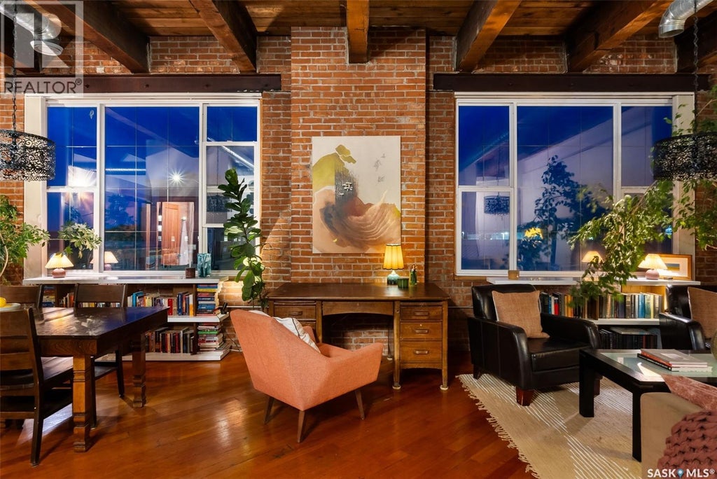 Luxury Loft in the Heart of the Warehouse District Experience urban sophistication in this one-of-a-kind warehouse loft, perfectly blending historic character with modern luxury. Featuring soaring ceilings, rich hardwood floors, striking exposed brick walls, and original wood beams, this home offers a warm yet industrial aesthetic that’s both timeless and inviting. Flooded with natural light from oversized windows—complete with custom Hunter Douglas blackout blinds—the open living space is enhanced by bespoke millwork and thoughtful design touches throughout. The chef’s kitchen is a showpiece, equipped with a 36” Wolf gas range and industrial-grade stainless steel appliances. The spa-inspired 4-piece bath boasts a rejuvenating jet tub and a truly unique soapstone pedestal sink, while the generous bedroom is large enough to accommodate a king-size poster bed, a relaxing hang out area, and features a custom closet organizer for ideal storage. Located in the vibrant Warehouse District, you’ll be just steps from boutique shopping, trendy coffee shops, and fitness studios, making it the perfect home for both work and play. Additional highlights include low condo fees of just $218.75/month, building is pet friendly with restrictions, and an exceptional blend of architectural charm with modern conveniences. This rare 1 bedroom, 1 bathroom loft is a statement in urban luxury—ideal for the discerning buyer who appreciates design, comfort, and lifestyle. Reach out to your Realtor® today to book your personal tour. (id:6289)