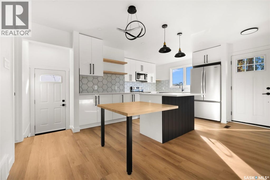 Professionally re-developed by Bouss Construction, this Walsh Acres home has been completely transformed with quality craftsmanship and thoughtful design from top to bottom! Located in a prime 10/10 location, this property sits with neighbours on only one side and is just a short walk to both elementary and high schools. Step inside and you’ll immediately notice the bright, open layout with sleek vinyl plank flooring and a neutral colour palette that feels fresh and inviting. The kitchen has been carefully reimagined for both function and style, featuring quartz countertops, white cabinetry with black hardware accents, Hevea wood shelving, a centre island with an integrated dining table and brand-new stainless-steel appliances. The living room impresses with large windows and a custom feature wall complete with a built-in electric fireplace, TV insert and side shelving for a modern, polished look. Down the hall, you’ll find three bedrooms, perfect for families or a home office, along with a fully renovated 4-piece bathroom showcasing custom tilework and updated fixtures. The basement adds more living space with a spacious rec room, additional bedroom, 3-piece bathroom and a laundry/utility room with extra storage space. Outside, you’ll appreciate the oversized single detached garage with a new overhead door and a yard full of potential for future outdoor living. With updated windows throughout, H/E furnace, newer shingles and a brand-new washer and dryer this home is 100% move-in ready. As the saying goes, location, location, location — and this one truly checks every box. (id:6289)