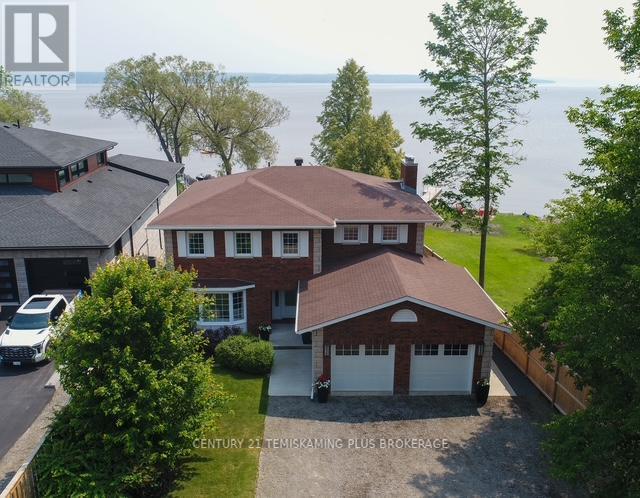 Stunning 4-bedroom waterfront home on Lake Temiskaming with private sandy beach and breathtaking views. This beautifully maintained 2-storey brick residence features a fully renovated kitchen with high-end JenAir appliances, 3 modern bathrooms, a cozy wood-burning fireplace, and a luxurious primary suite with heated floor ensuite. Enjoy 2,400 sq ft of elegant living space, an attached double garage, and an insulated basement ready for future development. Located in a sought-after lakefront neighbourhood, this year-round home offers the perfect blend of comfort, style, and lifestyle. A rare opportunity to own premium waterfront in Temiskaming Shores.MPAC:313. Hydro cost:1,667.12 per year and Natural gas: 1,346.95 per year (id:6289)