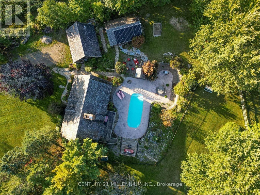 Welcome to this enchanting log home that perfectly blends rustic charm with modern comforts. Nestled on a serene one-acre lot in the rolling Caledon Hills, this beautiful property offers a peaceful country lifestyle just minutes from town. Inside you are greeted by original beamed ceilings, wide plank floors and a striking stone fireplace that serves as the heart of the home. The open living and dining areas flow together creating a warm and inviting atmosphere ideal for both everyday living and entertaining. Waking up in the spacious 2nd floor primary bedroom brings joy to each mornings as the sun peeks over the horizon in this east-facing retreat that features a private lounging area & direct walk-out access to the backyard pool, garden & trees. The third-level loft & 4th bedroom are also hidden gems, ideal as a quiet getaway spot or perfect for guest rooms. Outdoors, you'll find winding flagstone pathways, lush perennial & pollinator gardens plus a cozy fire pit for unforgettable evenings under the stars. Hobbyists and DIYers will appreciate the large detached workshop/shed offering endless possibilities for creative projects or extra storage. Originally crafted from Ottawa Valley square logs and reassembled in Caledon in 1983, this home has aged beautifully with a silver patina that blends seamlessly into its natural surroundings. And when you're ready for an adventure, quaint villages, scenic hiking trails, ski slopes, art galleries and cozy cafes are all just a short drive away. This isn't just a house - it's a place to slow down, breathe and truly feel at home. Pool has been prof maintained, opened & closed. Pool pump new in 2021. Solar controller system (pool) new in 2023. WETT inspection of Wood Fireplace passed Jan 2025. Primary heating is by propane stove with electric baseboard as backup. (id:6289)