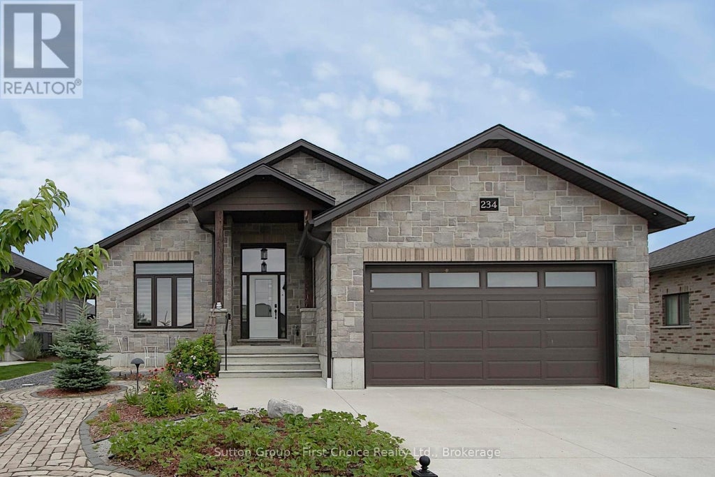 Discover the charm and modern appeal of 234 Matheson Drive! Built in late 2018, this beautifully crafted brick and stone bungalow offers five bedrooms, three bathrooms - all within a thoughtfully designed layout. Step inside to an inviting open-concept living space with vaulted ceilings, seamlessly connecting the kitchen, dining, and living areas ideal for hosting and everyday gatherings. The main floor features a spacious primary suite with a walk-in closet and ensuite, complemented by two additional bedrooms and a full bathroom. Downstairs, the fully finished basement expands your living space with two additional bedrooms, a bathroom with in-floor heating, a large rec room, a cozy hobby nook, and plenty of additional storage. Outside, enjoy the landscaped yard from the welcoming front porch, or unwind on the back deck. A two-car garage and concrete driveway offer ample parking. The homes prime location, just steps from Mitchell Golf Club and a short walk to downtown provides both convenience and a peaceful neighborhood setting. This is more than just a house; it's a place to call home. Book your private showing today! (id:6289)